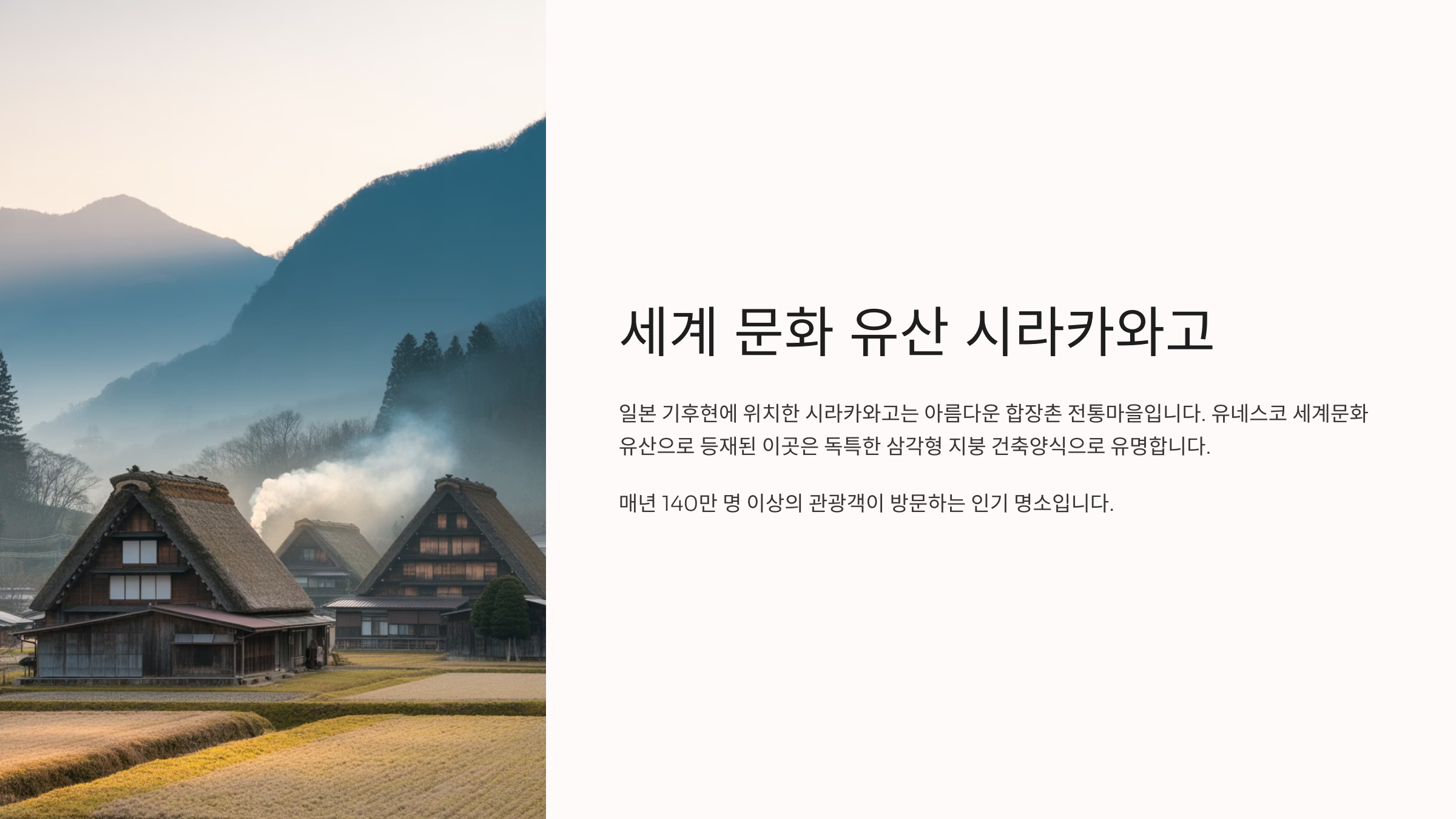 시라카와고는 일본 전통의 독특한 합장조 건축 양식으로 잘 알려져 있습니다.