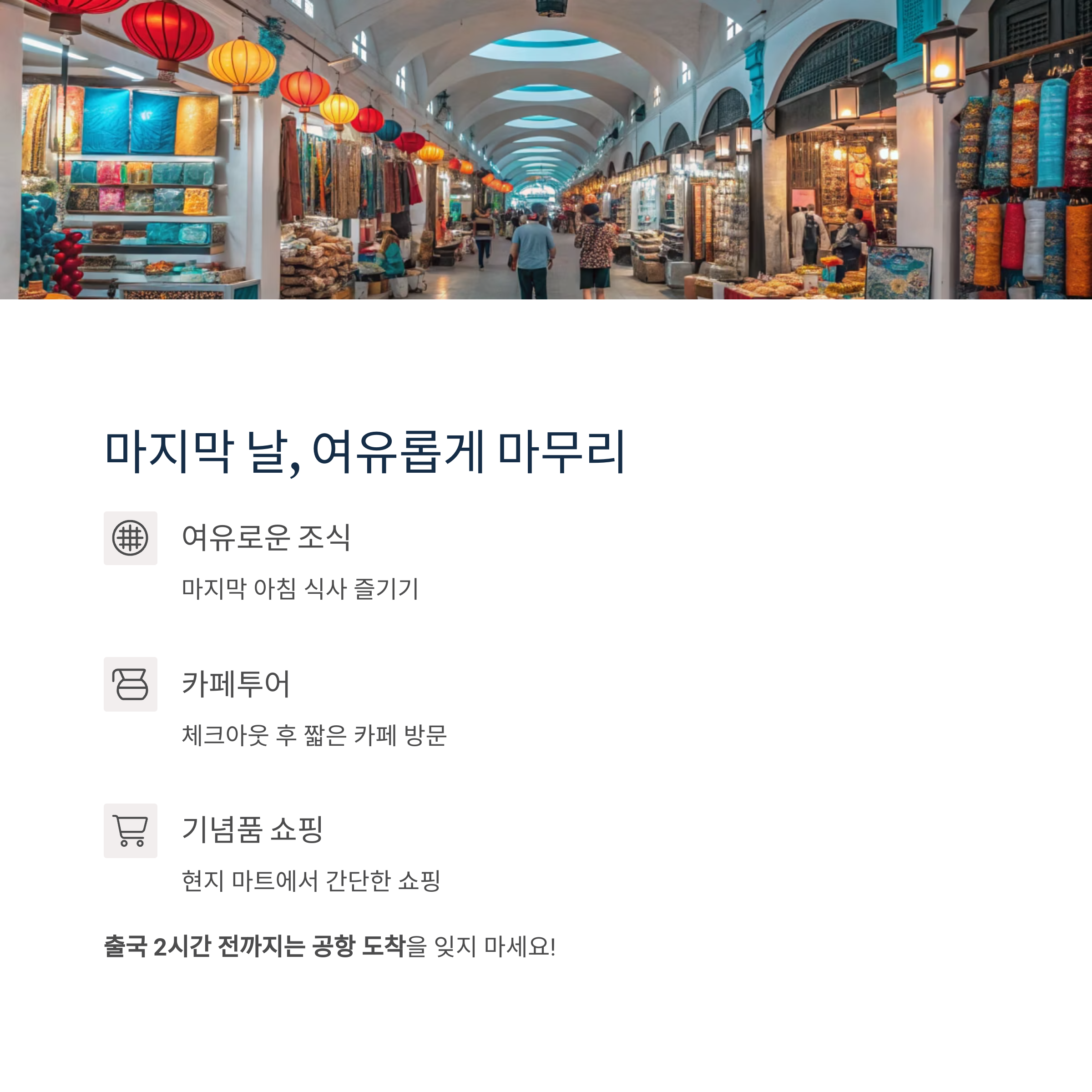 돌아가는 날엔 조식을 여유 있게 즐기고, 체크아웃 후 짧은 카페투어나 마트 쇼핑이 좋습니다. 공항으로 가는 시간까지는 현지 마트에서 간단한 기념품 쇼핑으로 마무리하세요.