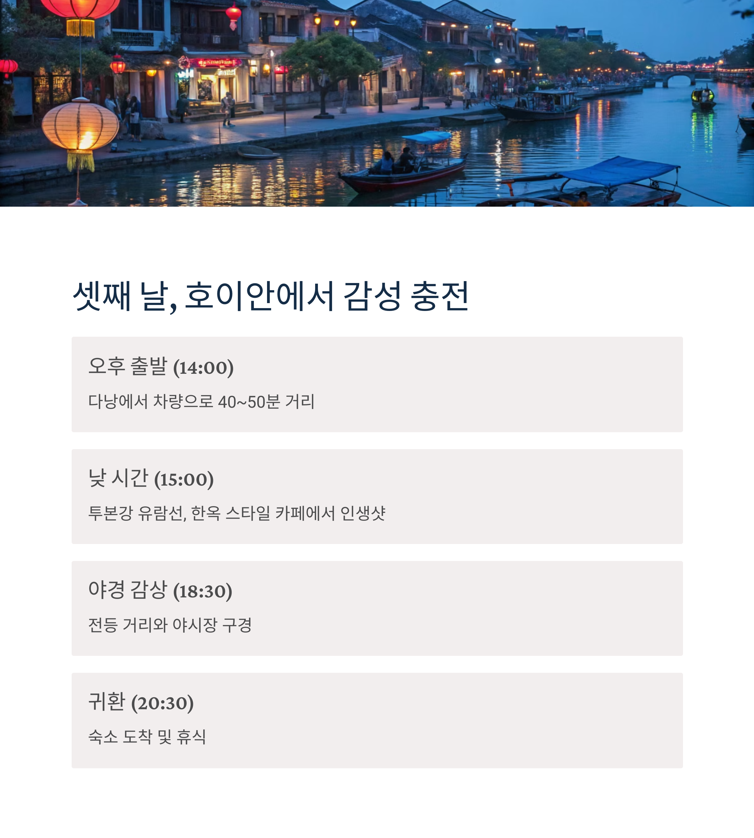 "첫날만 쉬고 둘째 날부터 움직이면 딱이야. 호이안도 밤에만 잠깐 가면 돼"