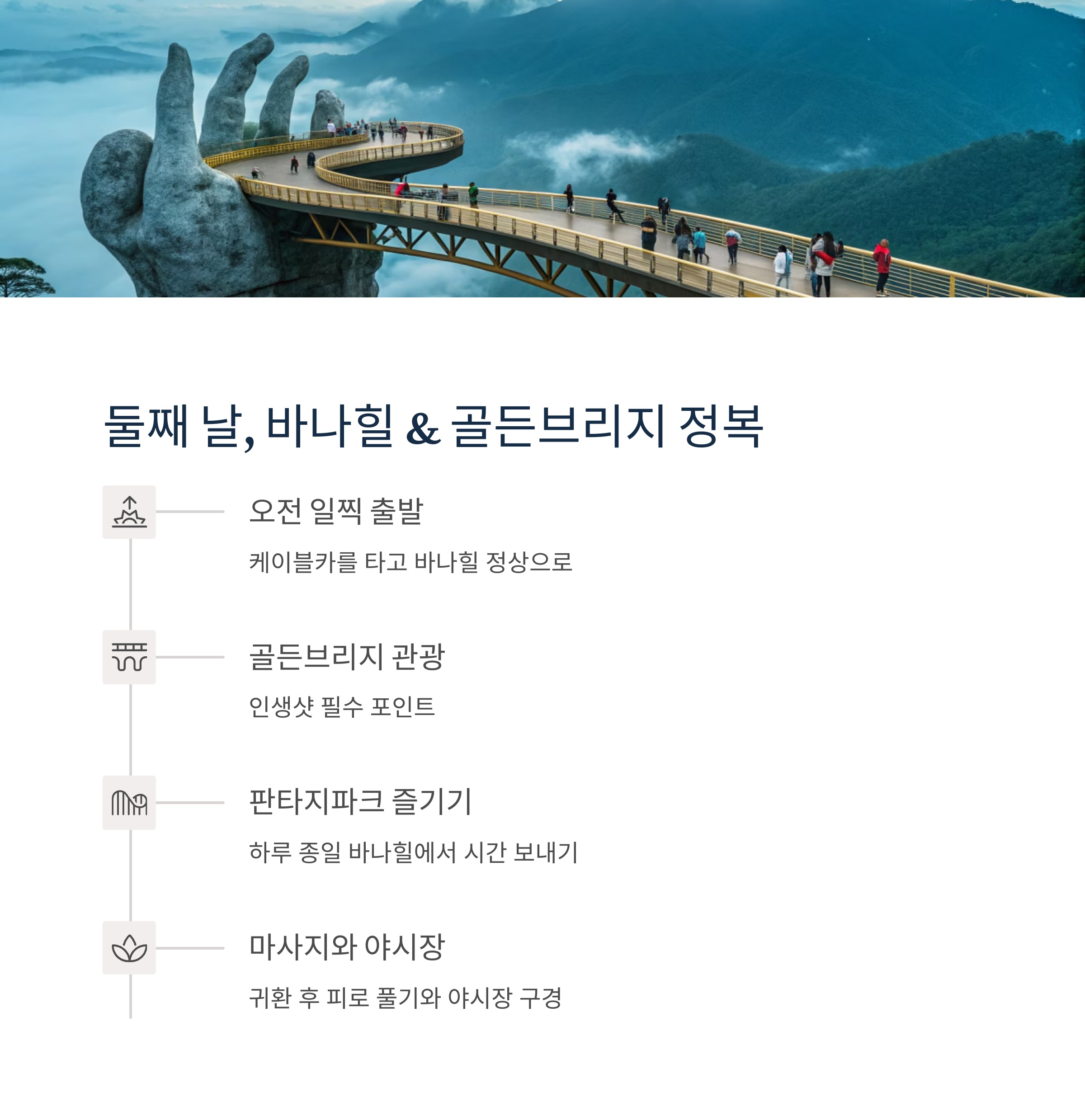 다낭 여행의 하이라이트 중 하나는 바나힐입니다. 오전 일찍 출발해 케이블카를 타고 바나힐 정상까지 올라가면, 유명한 골든브리지와 판타지파크가 기다리고 있습니다.