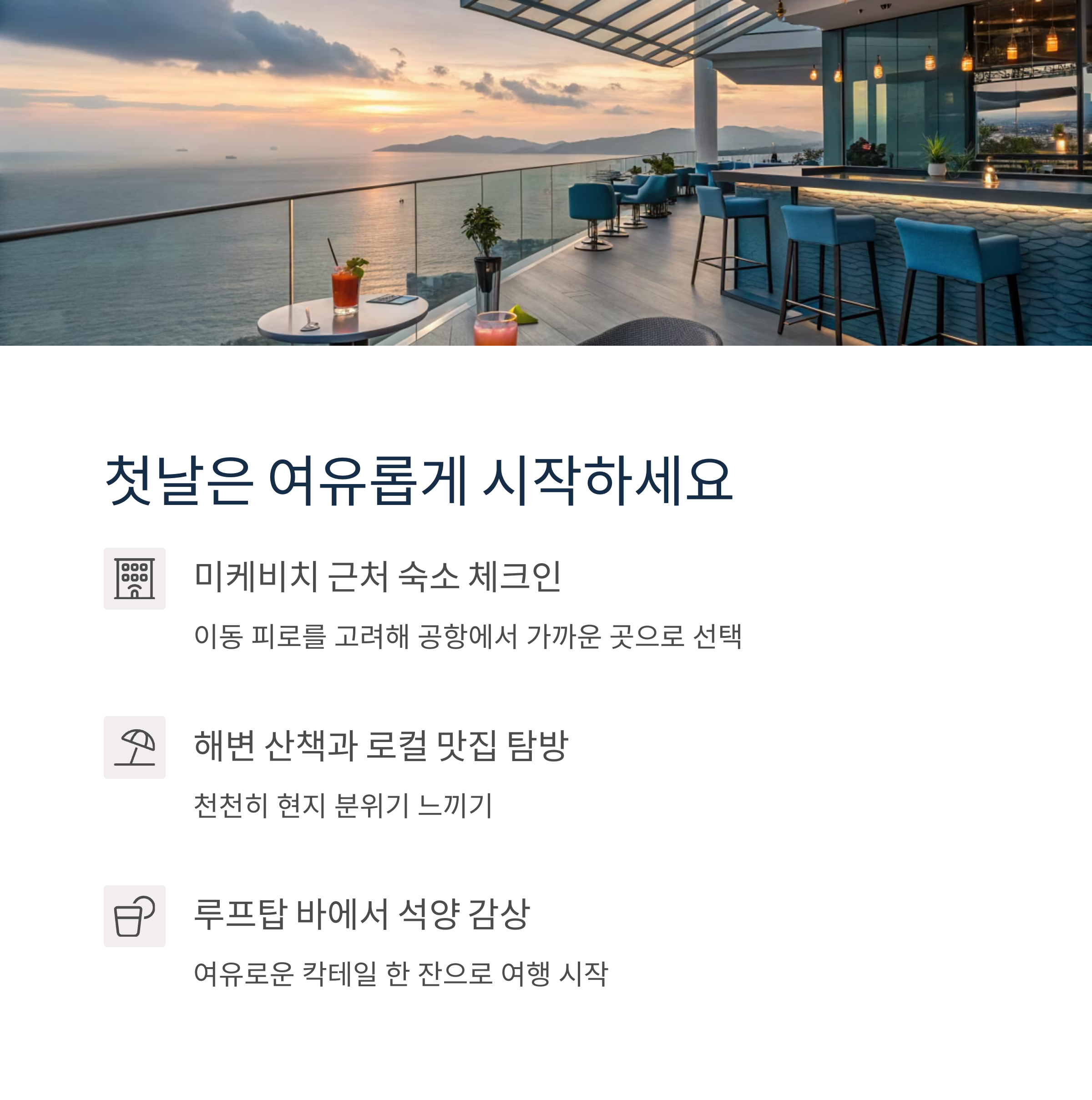 도착 당일은 이동 피로가 있는 날입니다. 공항에서 가까운 미케비치 근처 숙소에 체크인하고, 해변 산책과 로컬 맛집 탐방으로 천천히 여행을 시작해보세요.