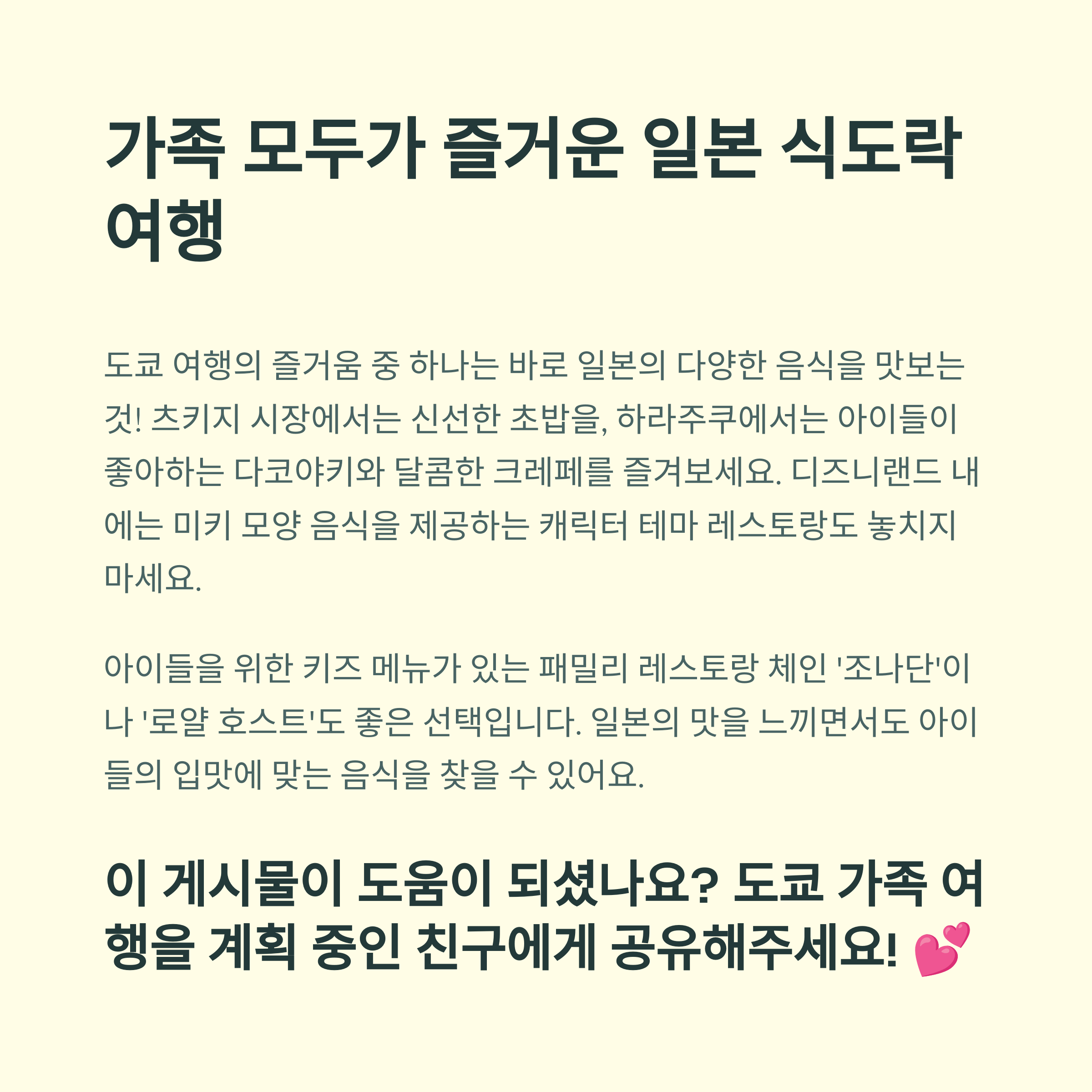 도쿄에서의 2박 3일 가족 여행은 알차게 계획하면 아이부터 어른까지 모두 만족할 수 있는 멋진 시간이 될 수 있습니다. 특히 디즈니랜드를 중심으로 한 일정은 아이가 좋아하는 놀이와 부모가 원하는 힐링을 동시에 충족시켜 주기에 매우 적합합니다. 여행 전 사전 준비와 정보 수집이 중요하며, 키즈 메뉴 제공 식당, 가족 숙소, 문화 체험지 등을 미리 알아두면 더욱 여유롭고 풍성한 여행이 될 수 있습니다. 위 일정을 참고하셔서 도쿄에서 가족만의 특별한 추억을 만드시길 바랍니다!