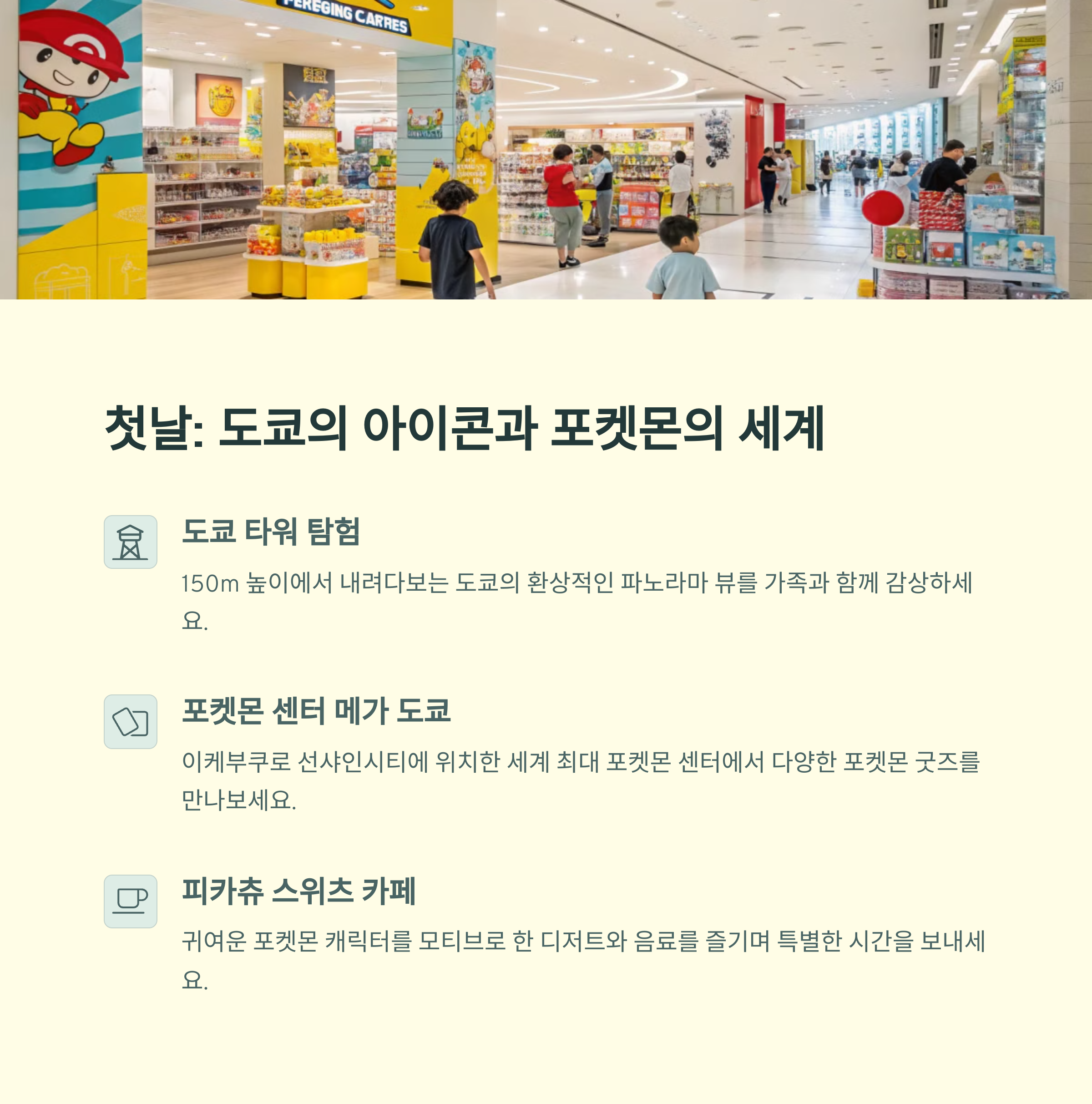 도쿄에 도착한 첫날은 여행의 시작을 부드럽게 열어주는 일정으로 구성하는 것이 중요합니다. 공항에서 호텔까지의 이동은 리무진 버스나 짐 배송 서비스를 활용하면 아이와 함께 이동하는 데 큰 도움이 됩니다. 숙소는 디즈니랜드 근처 또는 시내 중심지 중 가족 구성원에게 가장 적합한 곳으로 선택하고, 체크인 후에는 도쿄 타워를 방문하여 도시의 전경을 감상하며 여행의 설렘을 느낄 수 있습니다. 아이들이 좋아하는 포켓몬 센터도 이 날 방문하기 좋은 장소입니다. 하루의 마무리는 임페리얼 팰리스 주변에서 산책하며 차분하고 안정된 분위기를 즐기면 좋습니다.