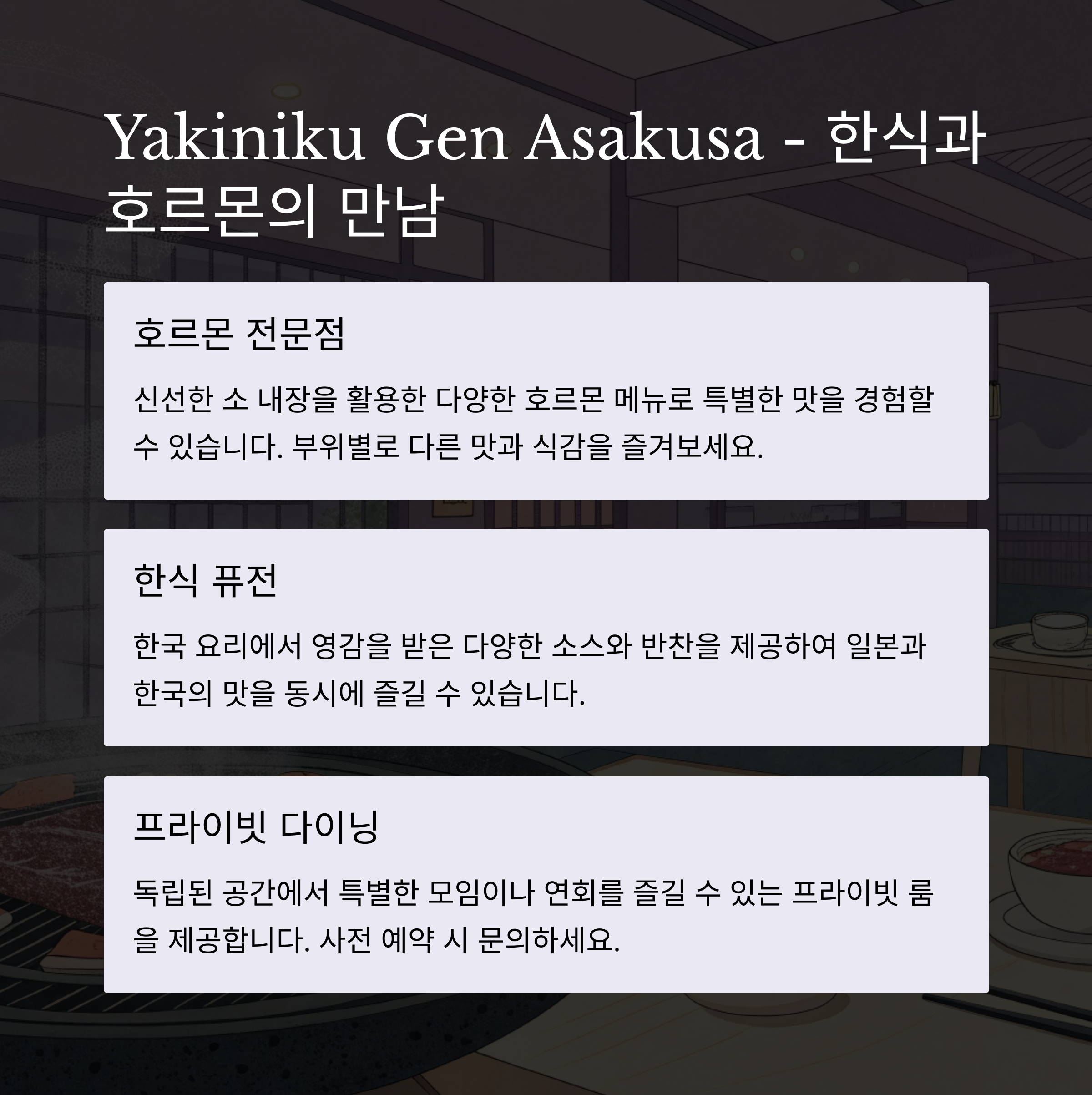 아사쿠사 야키니쿠 맛집은 각각의 매력과 개성이 돋보입니다. Wagyu Yakiniku Tokori는 고급스러운 요리와 개인실 옵션으로 특별한 경험을 제공합니다. Yakiniku Todoroki는 맛과 가격 균형이 알맞아 가성비를 찾는 고객에게 인기가 높습니다.