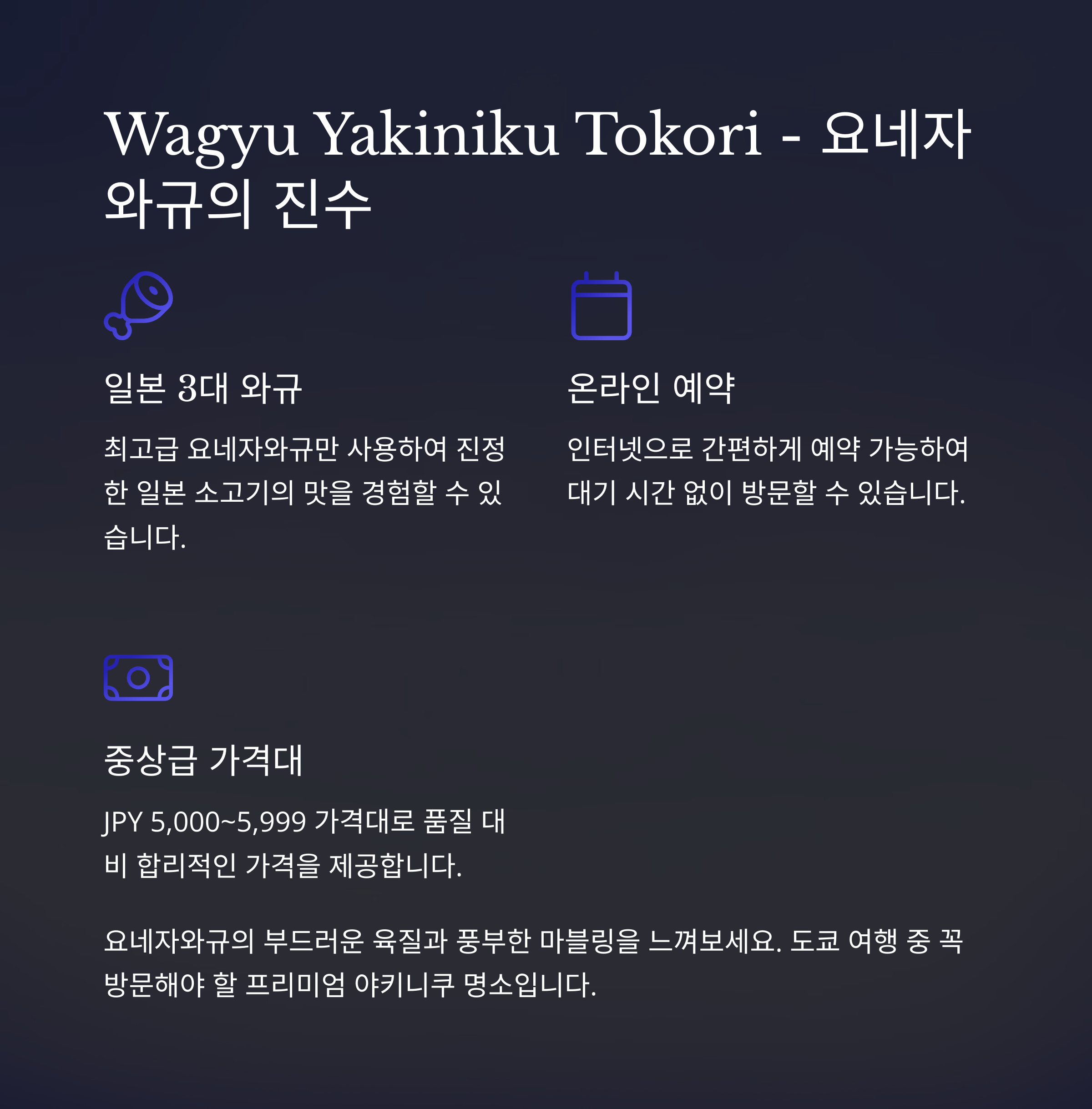 | 식당 이름 - Wagyu Yakiniku Tokori | 요네자와규만 사용 - 예약 필수 |