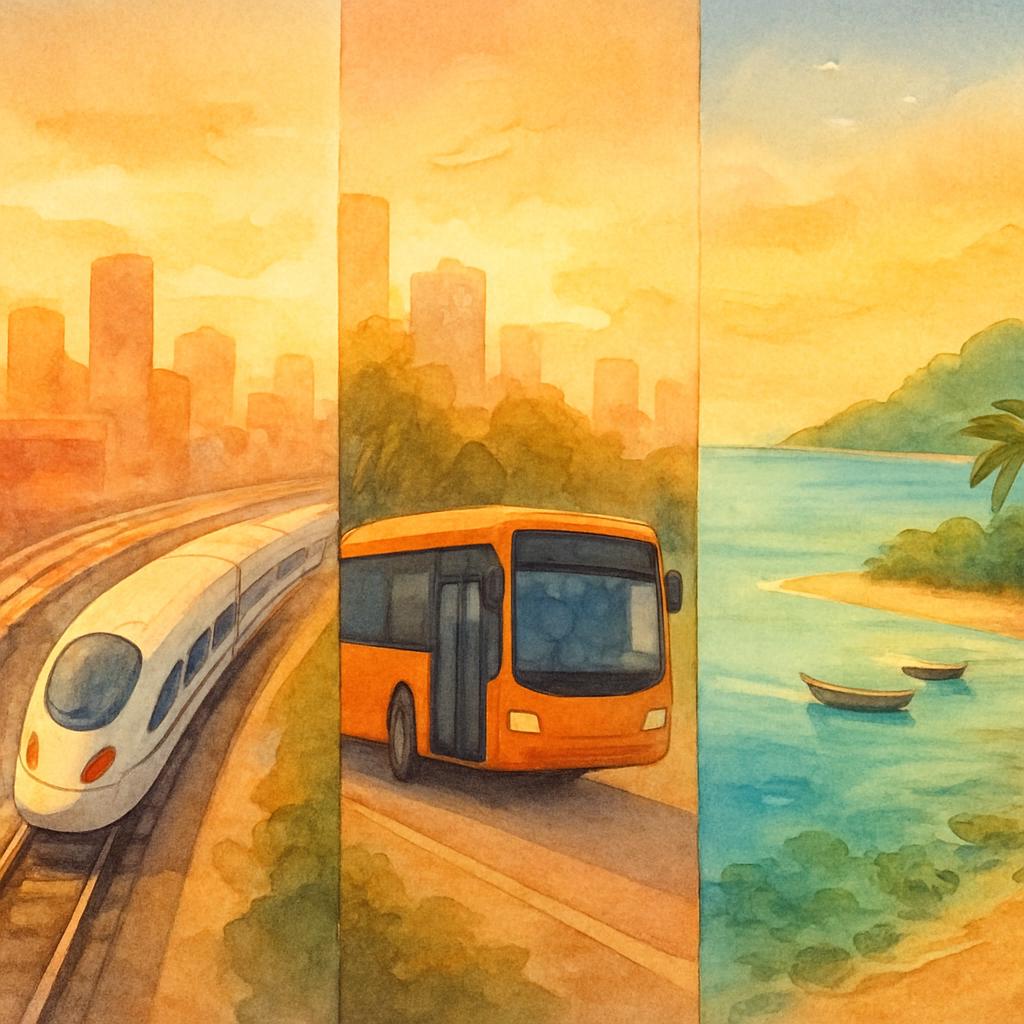도심은 버스와 택시를 기본으로, 더 편리한 이동은 Grab 같은 앱 호출 차량이 유용합니다. 장거리 이동은 기차나 고속버스로 비용을 절약할 수 있습니다.