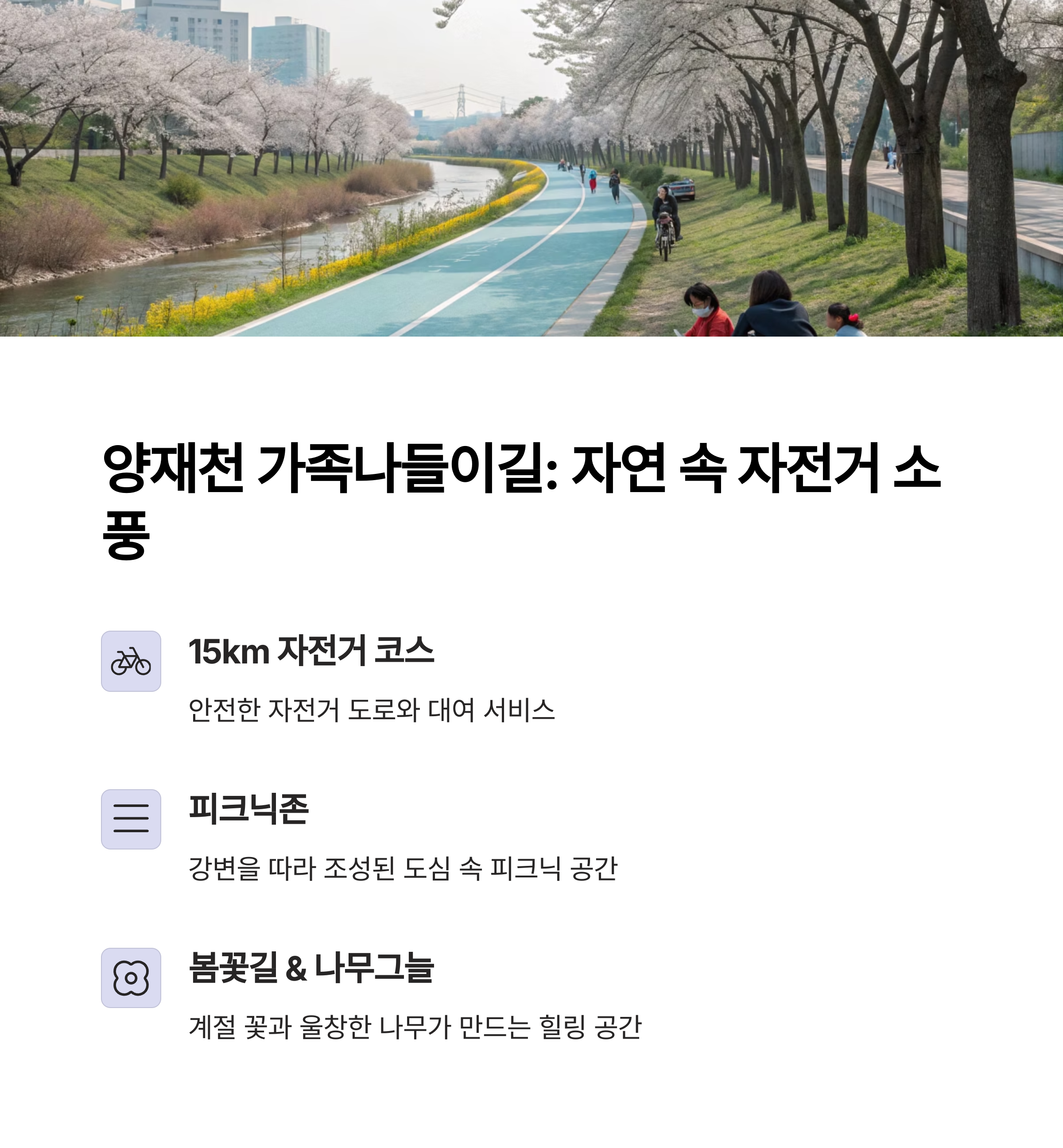 양재천은 잘 정비된 산책로와 자전거 도로가 매력적인 자연 나들이 코스입니다.