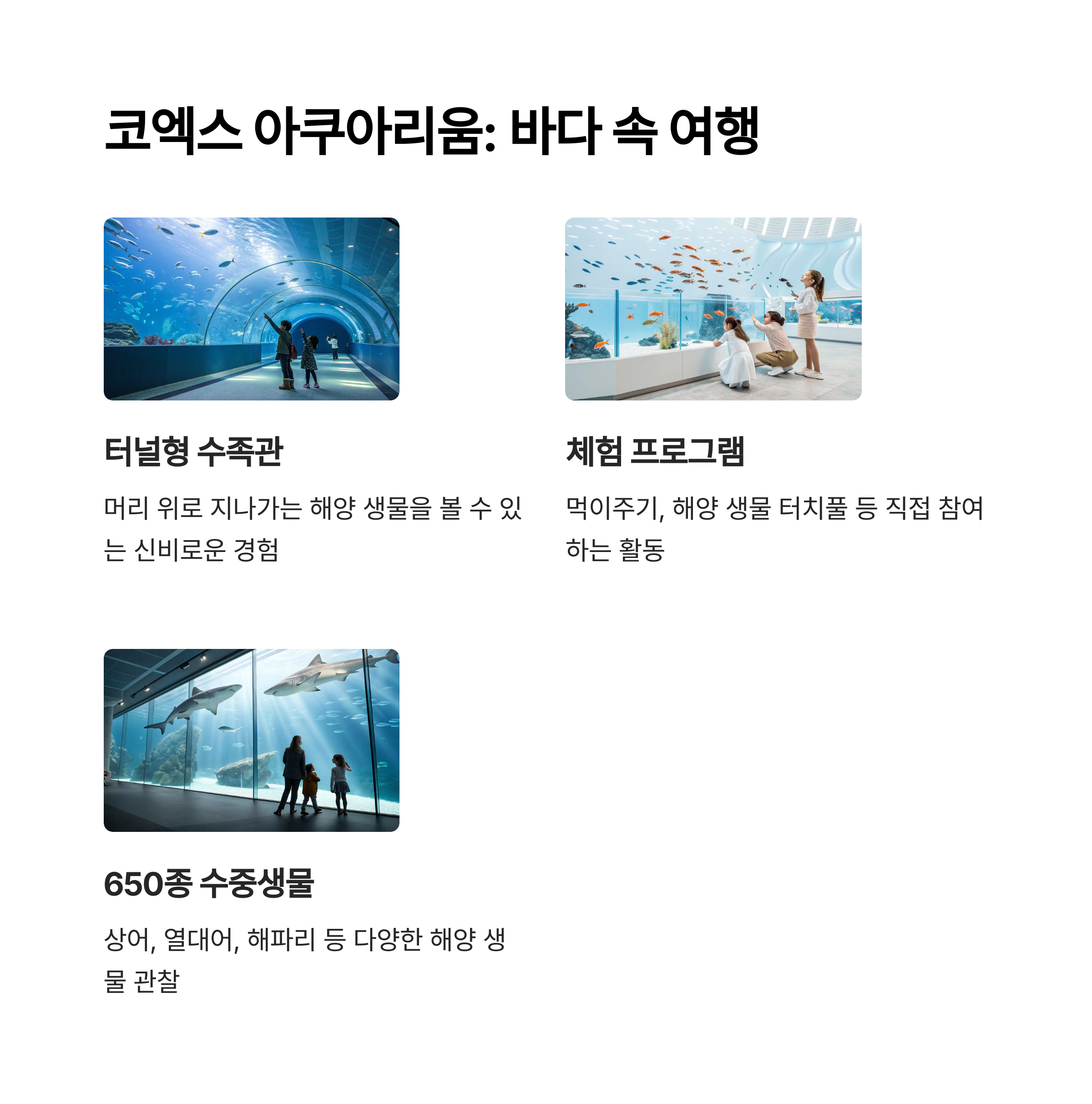 코엑스 아쿠아리움은 다양한 해양 생물을 가까이서 볼 수 있어 어린이들에게 인기가 많습니다.