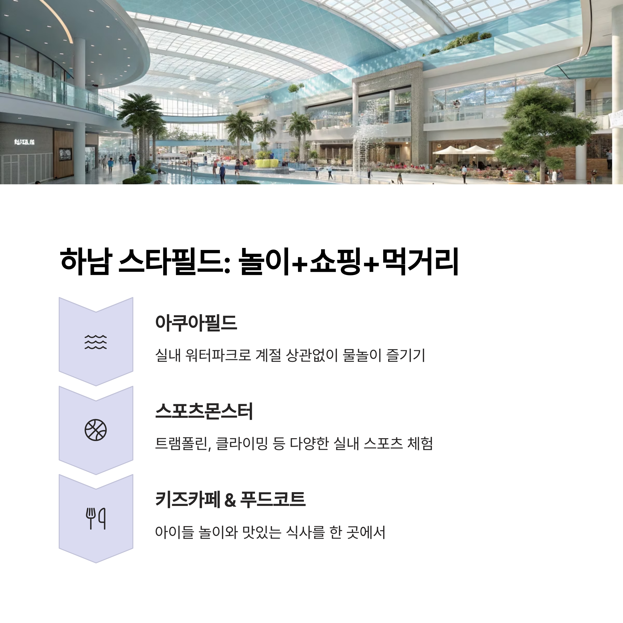 하남 스타필드는 키즈카페, 실내 스포츠 테마파크, 다양한 레스토랑까지 모두 갖춘 복합공간입니다.