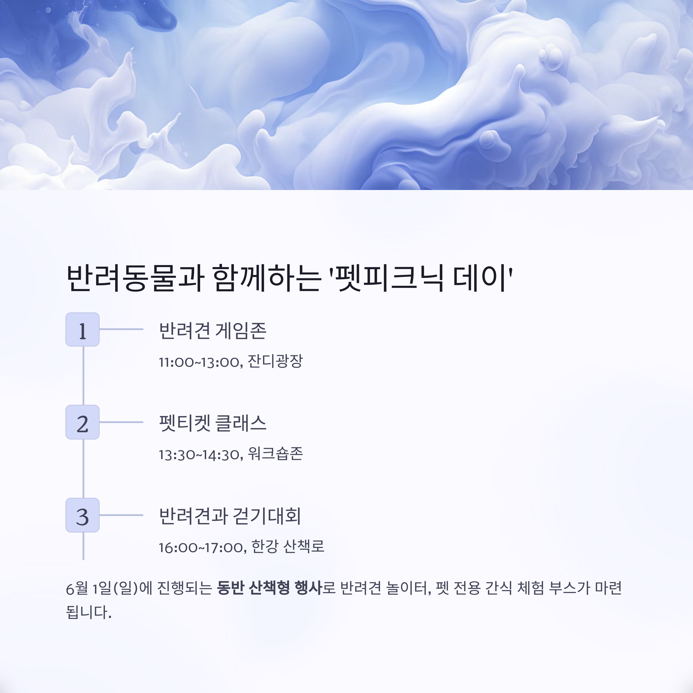 다음은 펫피크닉 데이의 주요 구성입니다: