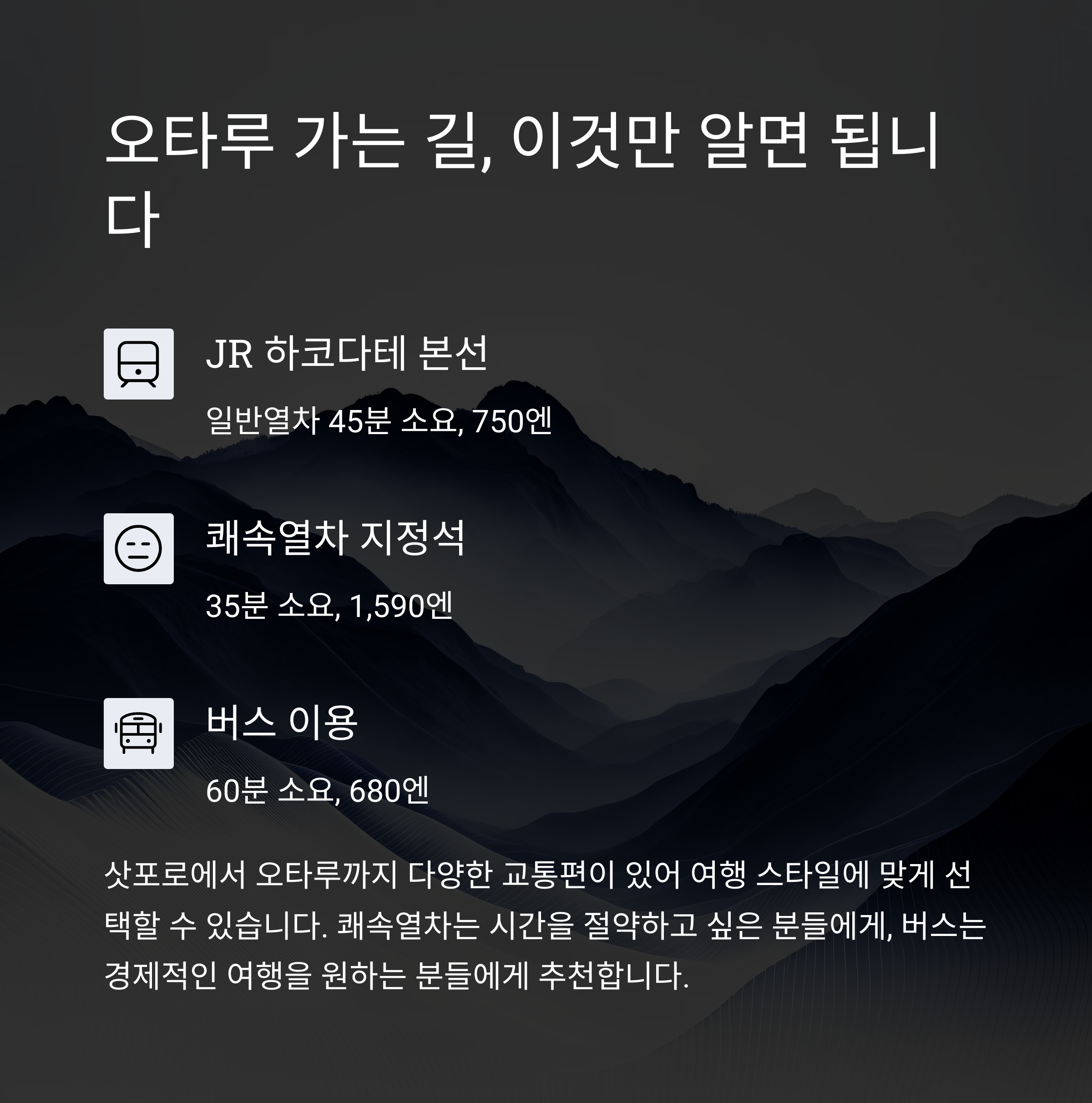 | 삿포로에서 오타루까지 소요 시간 | 약 35~40분 (JR 이용) |