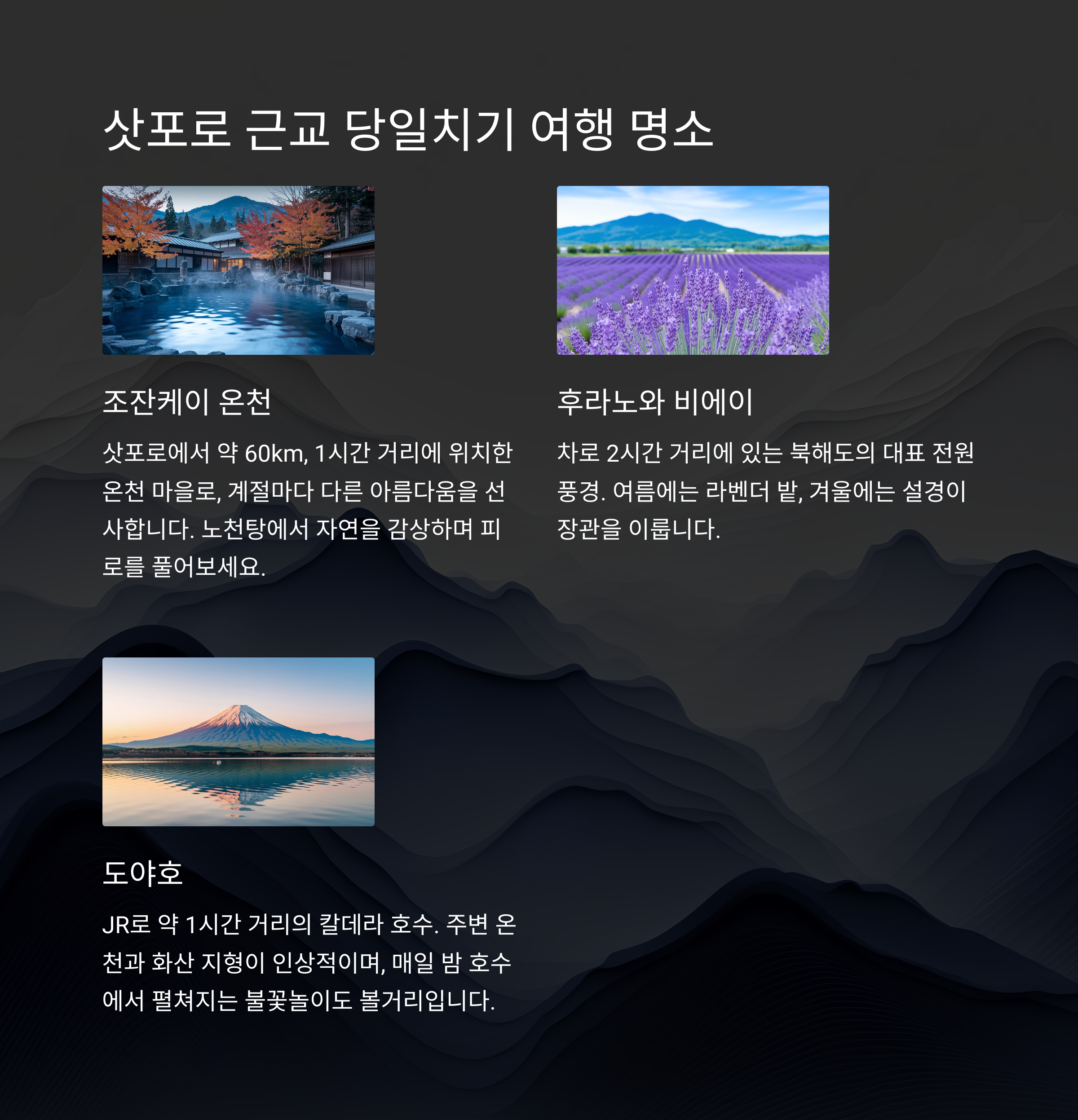 운하 산책 후 힐링 시간을 가지기에 완벽한 장소다. 삿포로에서 약 40분 거리에 있어 당일치기 여행에 최적화되어 있다. JR 패스를 이용하면 교통비도 절약 가능하다.