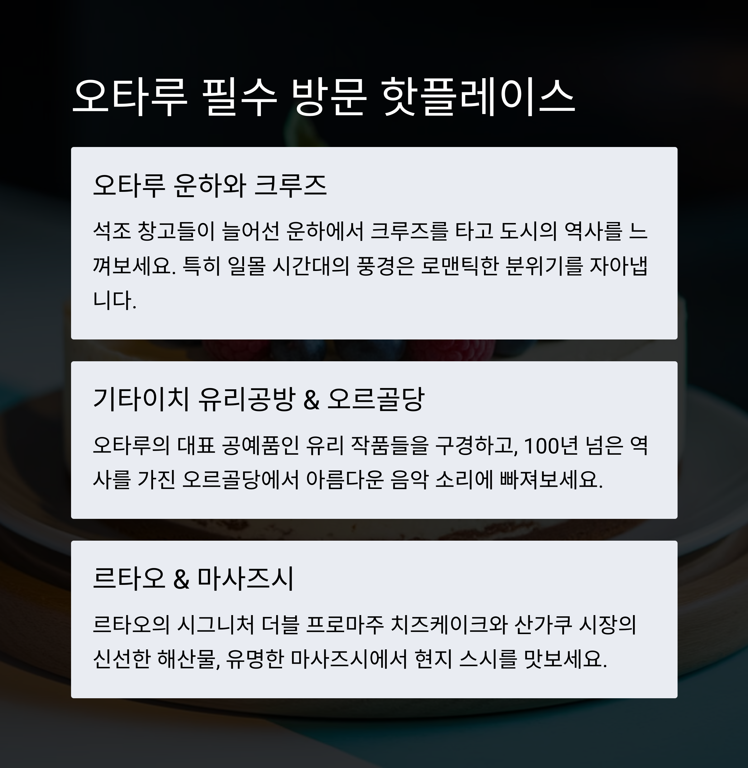 오타루는 짧은 시간 내에 중요한 명소를 둘러볼 수 있는 장점이 크다. 유리 공예와 전통 치즈케이크는 오직 오타루에서만 즐길 수 있다.