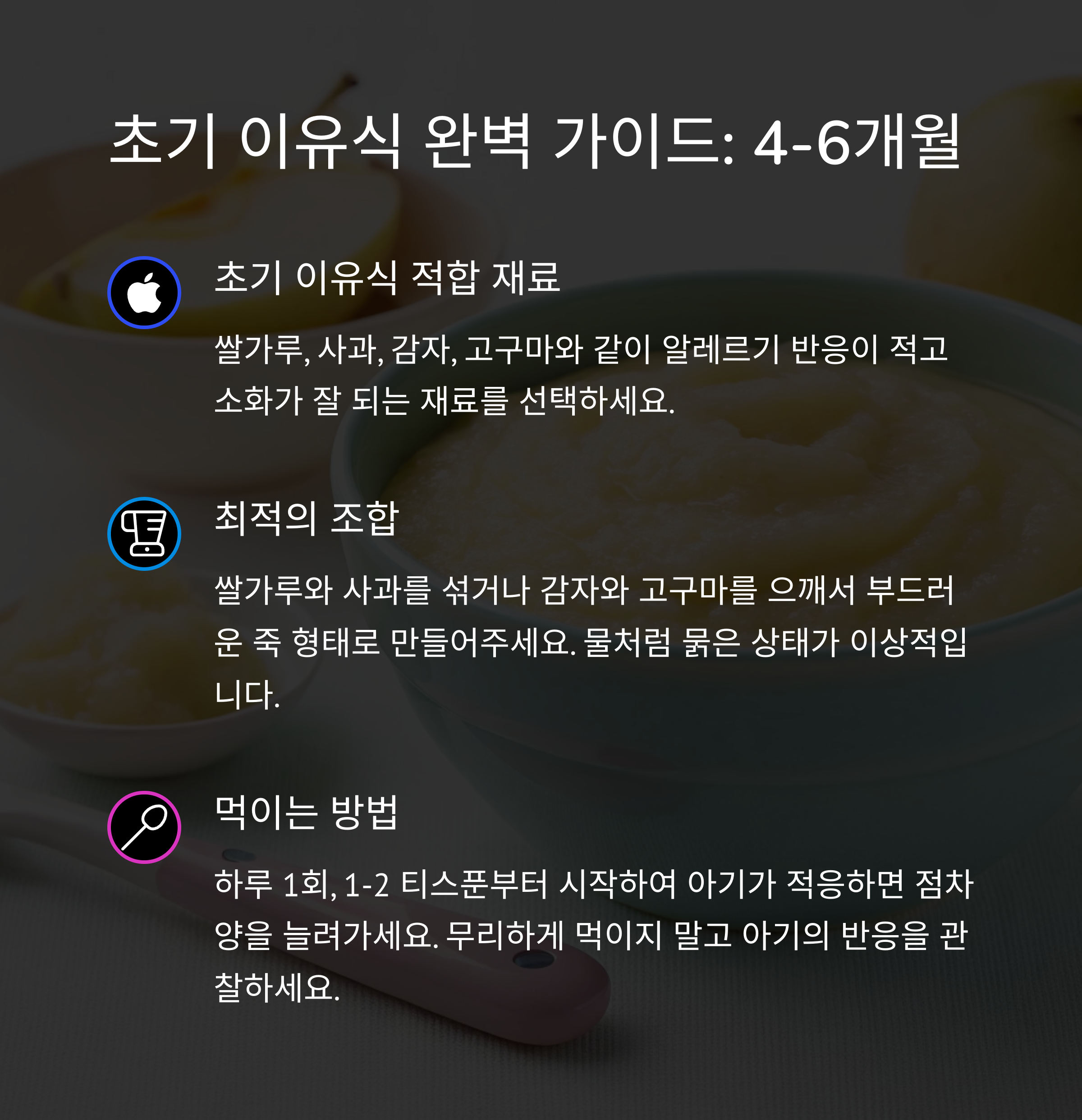 | 초기 | 쌀가루 + 사과 | 잘 갈아 퓌레로 만들기 | 부드럽고 소화 쉬움 |
