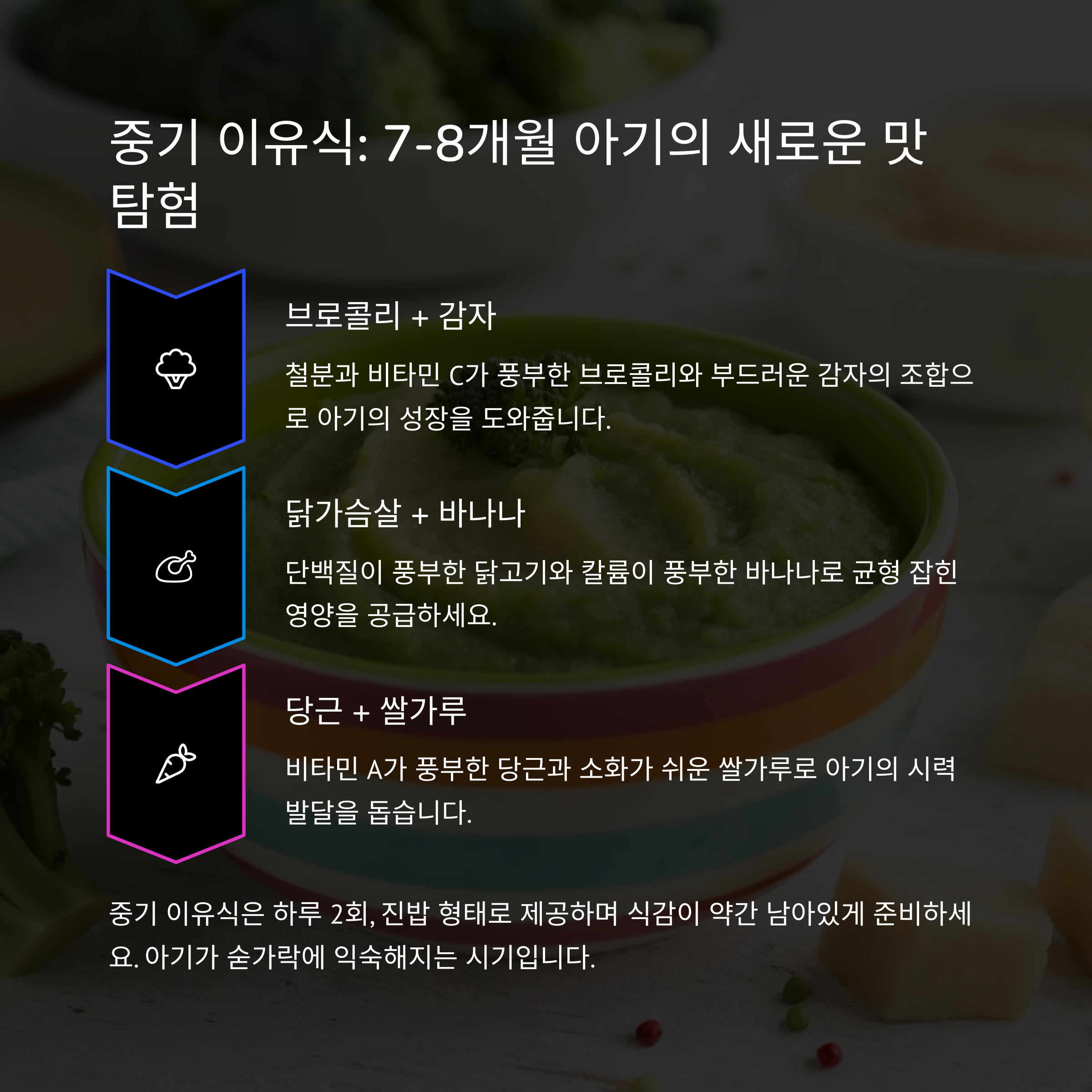 | 중기 | 브로콜리 + 닭고기 | 찌고 으깨서 섞기 | 영양소 풍부, 씁쓸한 맛 중화 |
