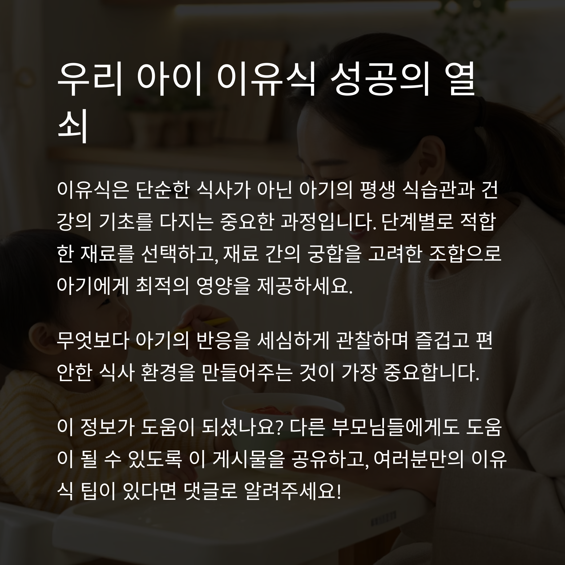 모든 조리 과정에서 안전과 위생을 최우선으로 유지하세요. 맞춤 이유식을 통해 아기의 건강한 출발을 응원합니다!