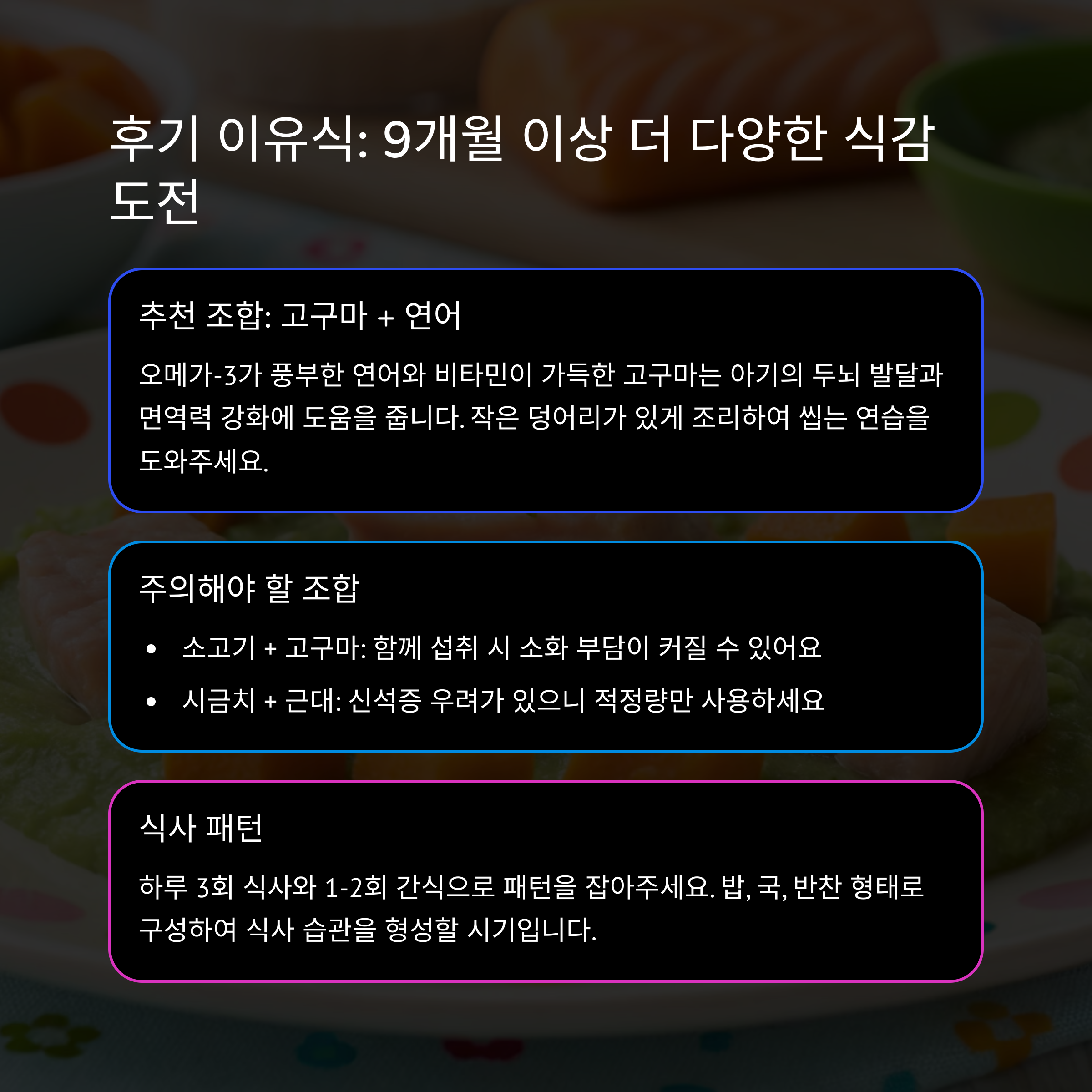 후기 이유식에서는 단백질과 비타민 공급을 강화하되, 소화에 부담을 주지 않는 조합이 중요합니다. 초기부터 적응 과정에 맞는 조리 방식과 질감을 유지하는 것이 이상적입니다.