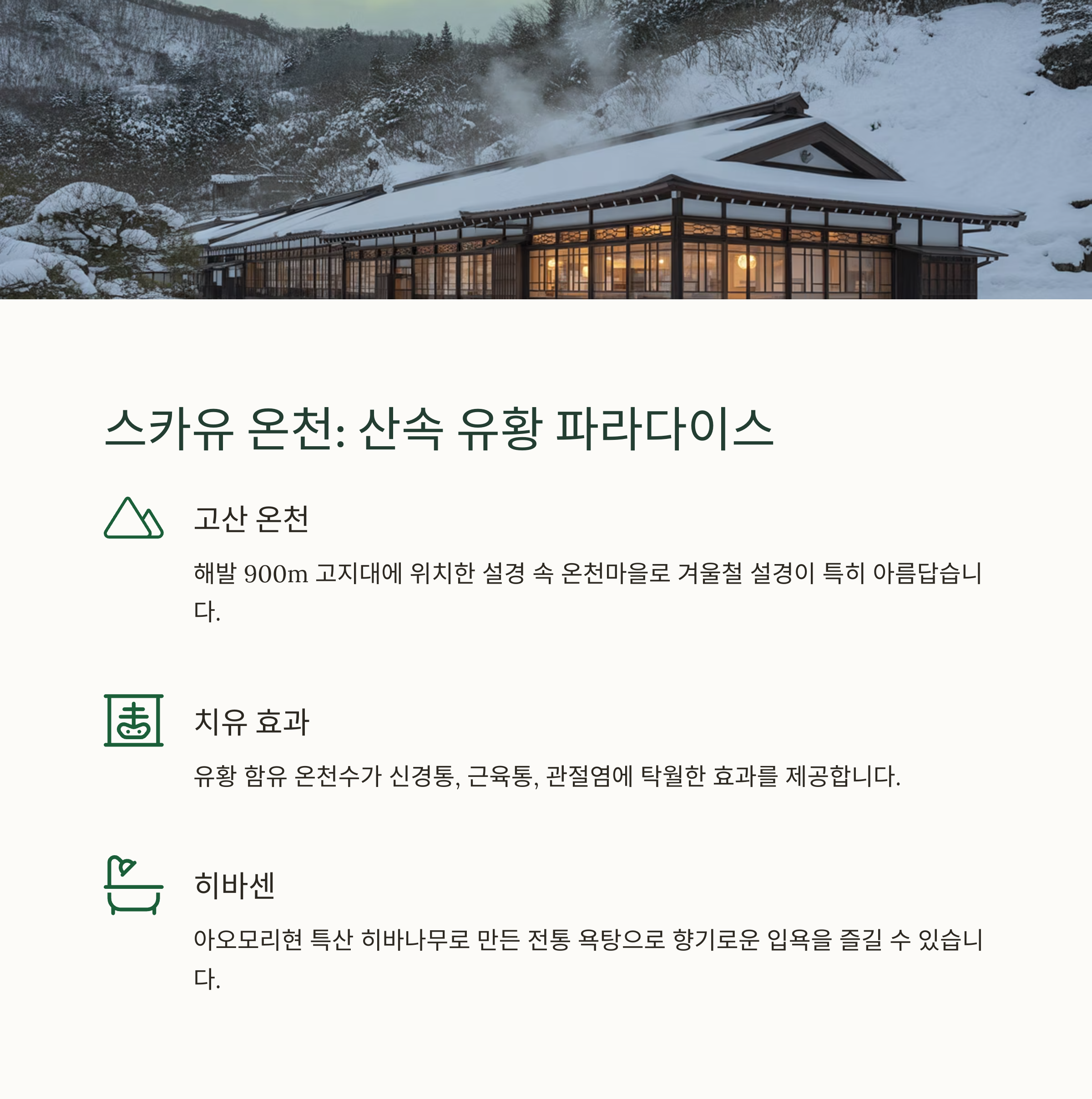 스카유 온천은 아오모리현 깊은 산 속에 자리 잡아 900m 고지의 설경을 감상하며 온천욕을 즐길 수 있습니다.