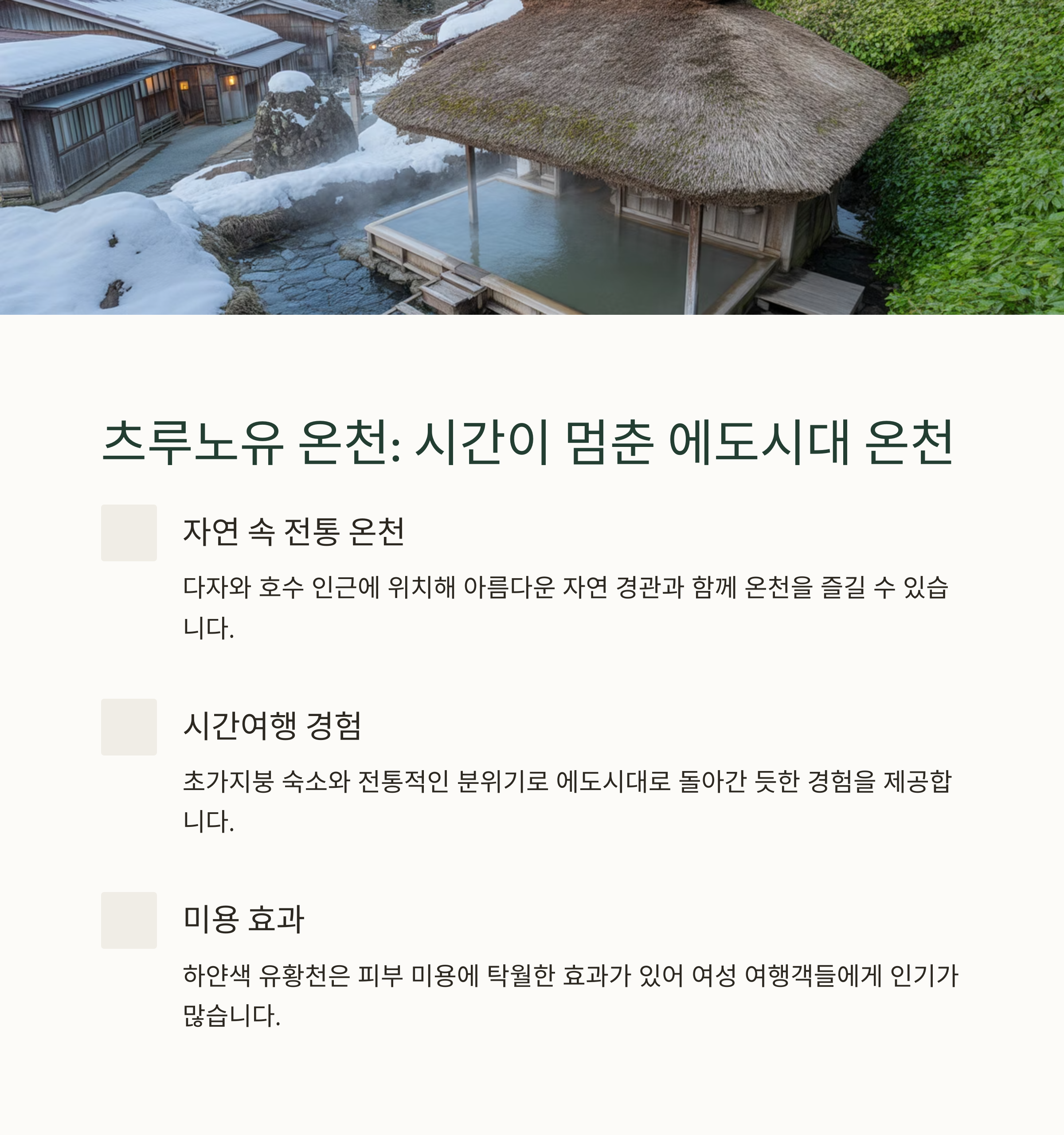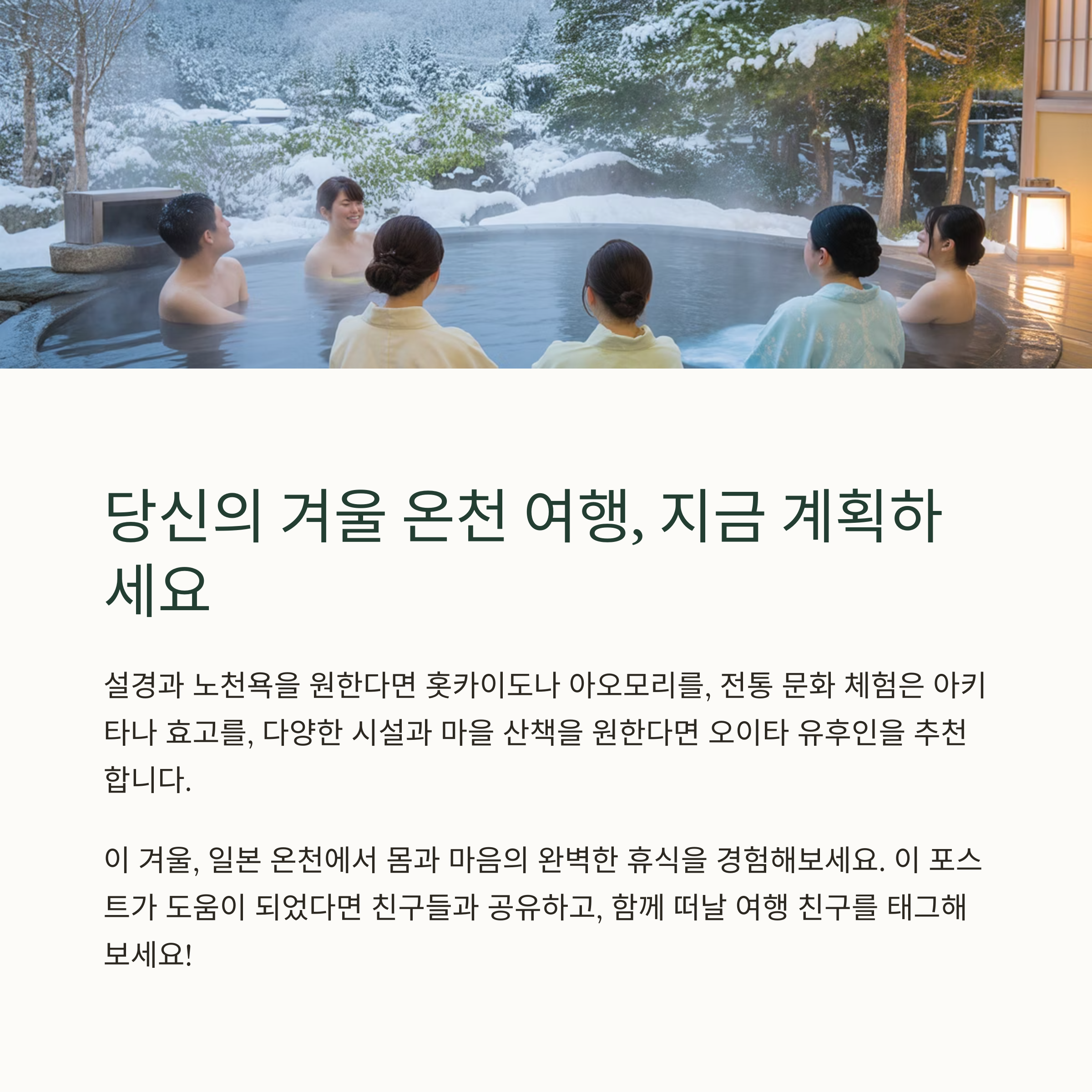 겨울 온천 여행은 차가운 겨울 속에서 따뜻한 일본 문화와 자연을 동시에 느낄 수 있는 특별한 경험을 제공합니다.