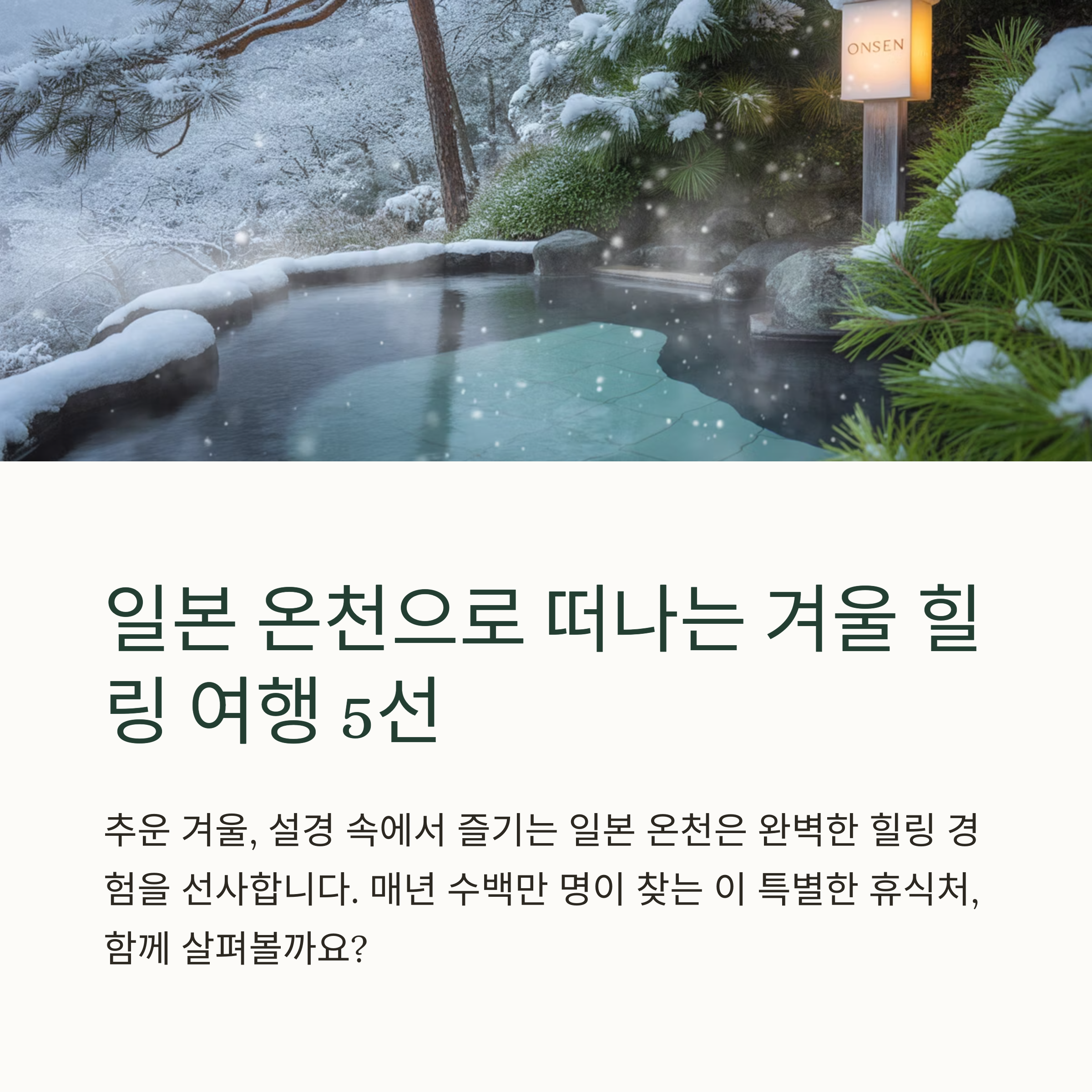 오늘은 일본의 겨울 온천여행을 주제로 추위를 이겨내고 여유로움을 느낄 수 있는 여행지를 소개합니다.