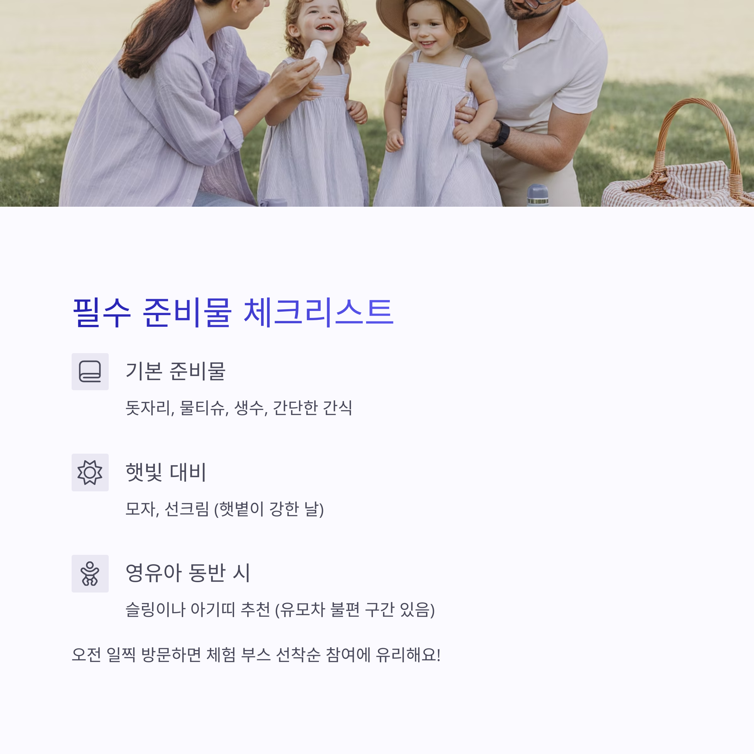 돗자리, 물티슈, 생수, 간단한 간식은 기본 준비물입니다.