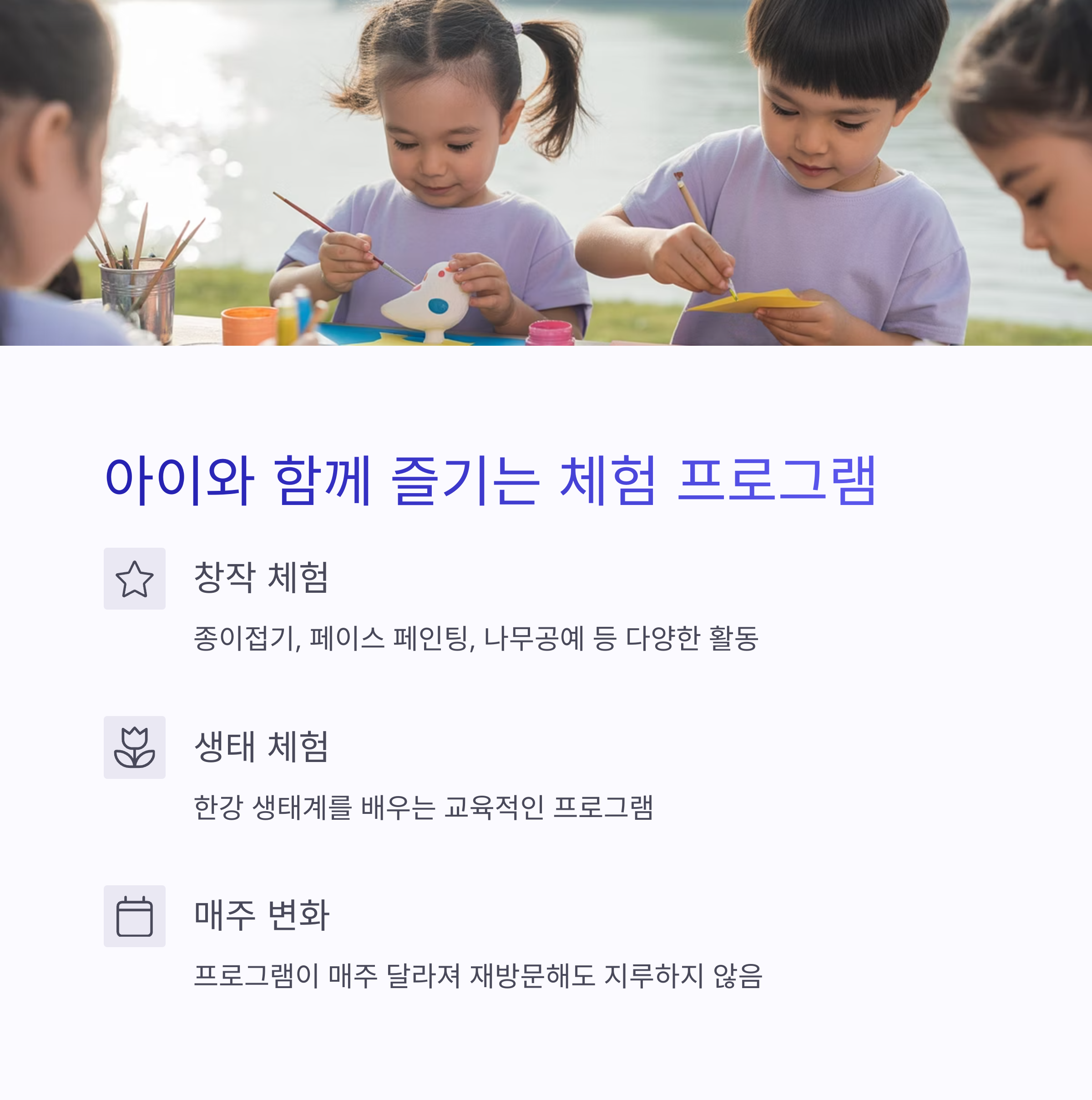 종이접기, 페이스 페인팅, 나무공예, 한강 생태 체험 등