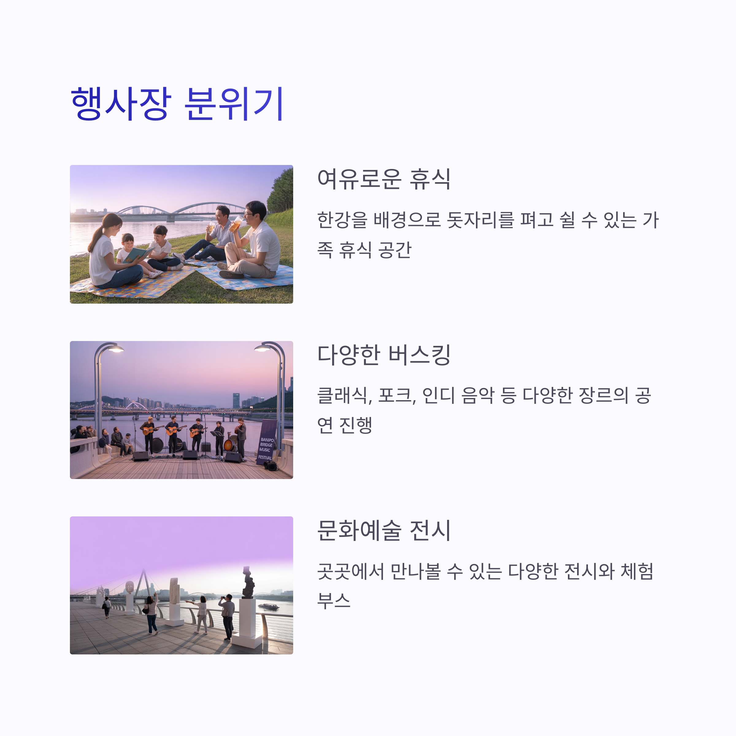 행사장은 전반적으로 한강을 배경으로 조용하고 여유로운 분위기입니다.