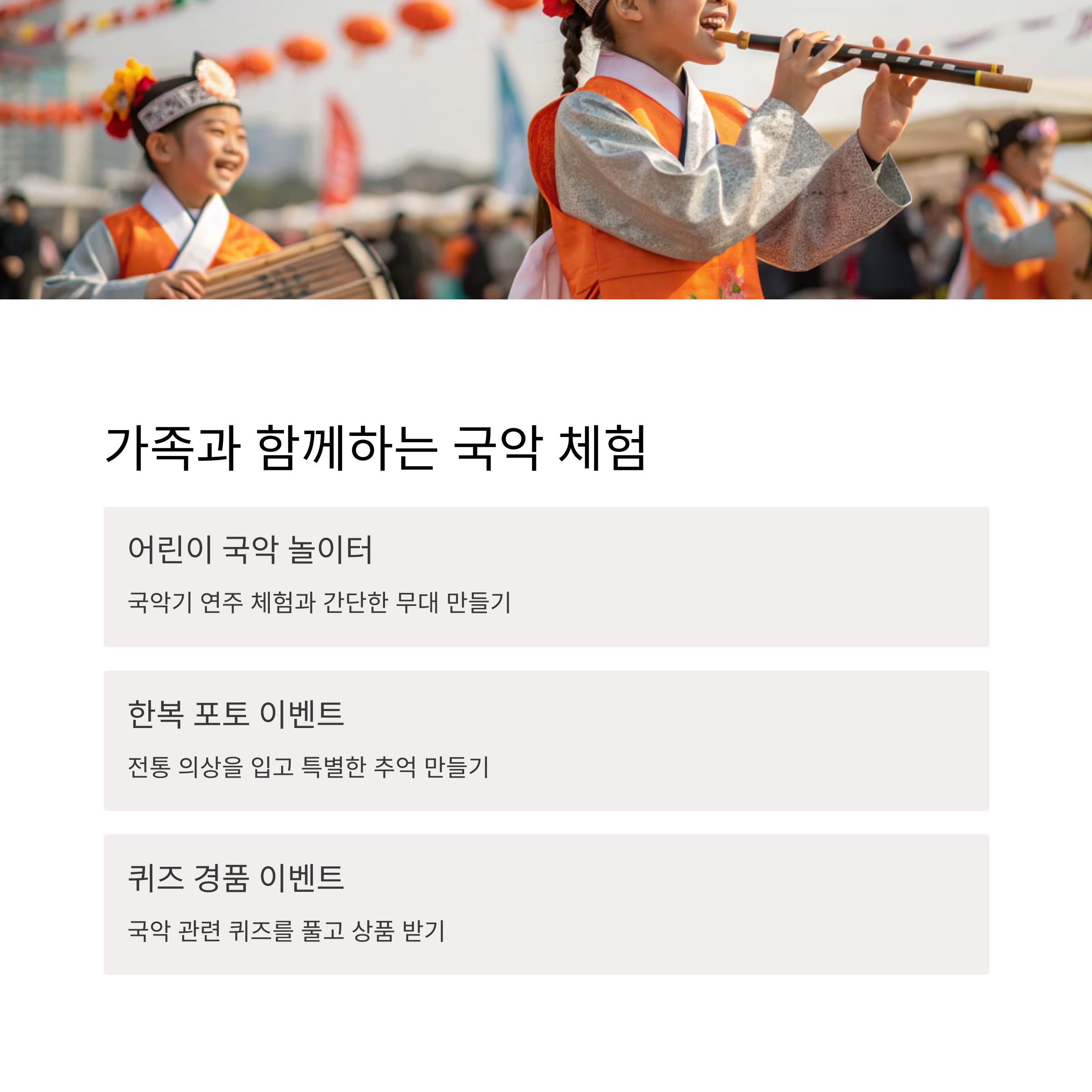 | 체험행사 | 악기 만들기, 장단 배우기 | 가족 단위 |