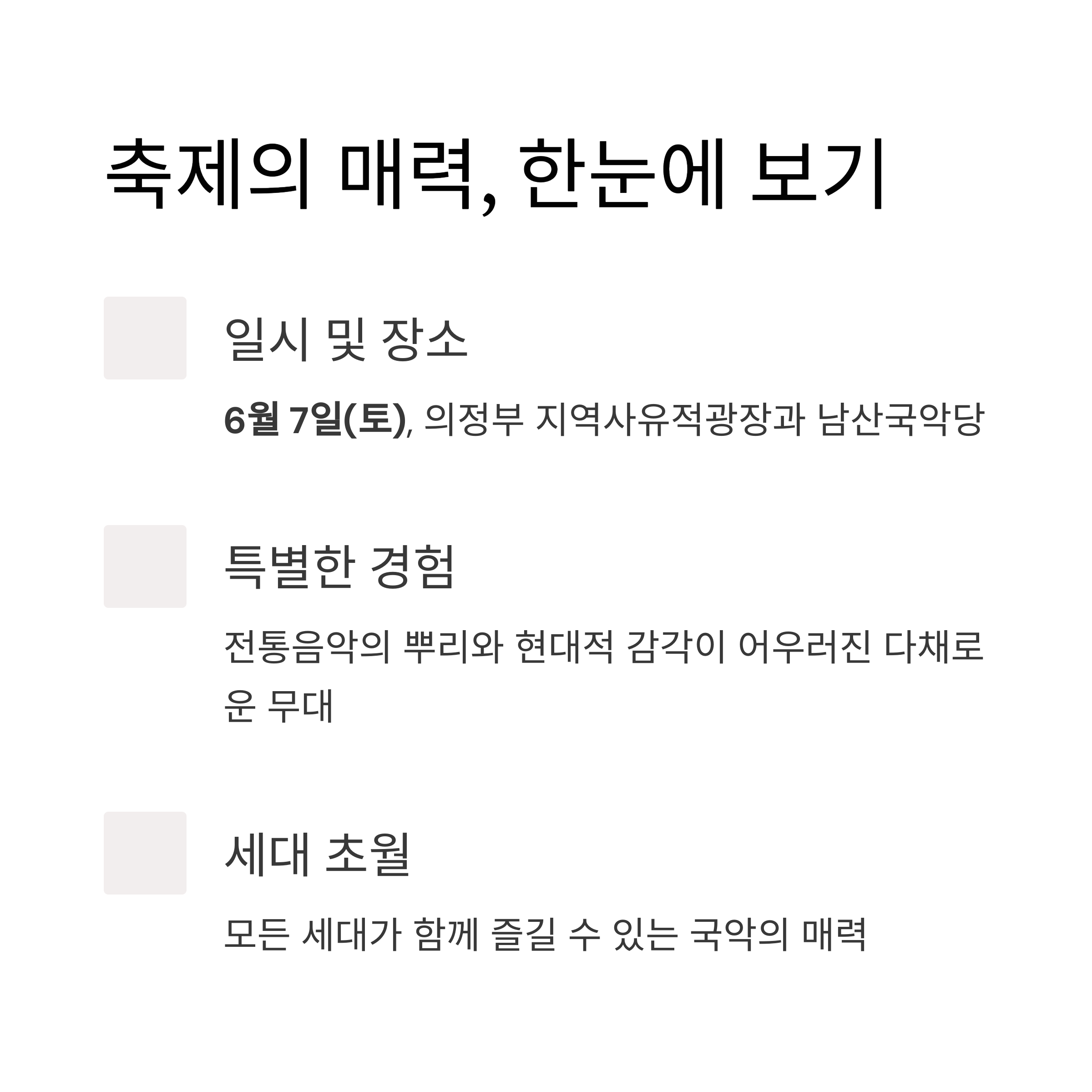 세대를 아우르는 국악의 매력을 도심 속에서 생생하게 만날 수 있는 소중한 기회입니다.