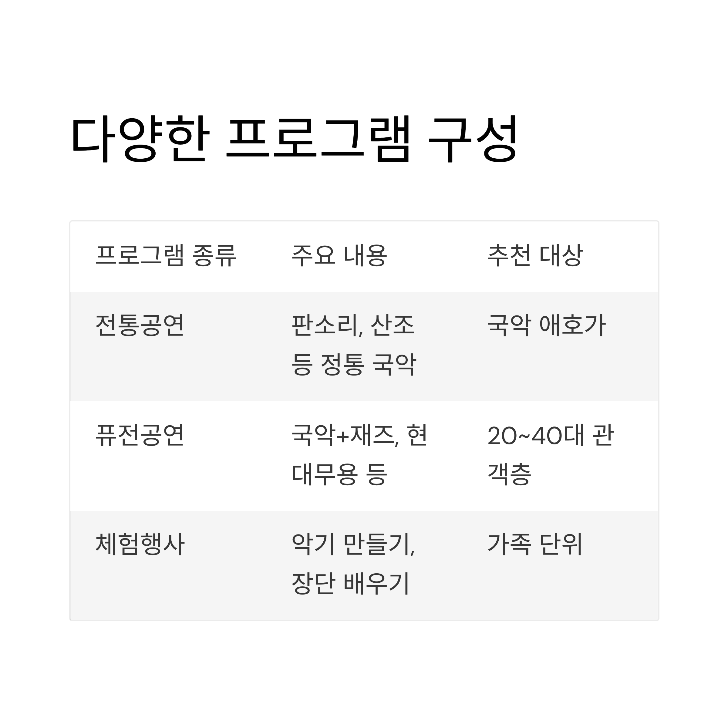 | 전통공연 | 판소리, 산조 등 정통 국악 | 국악 애호가 |