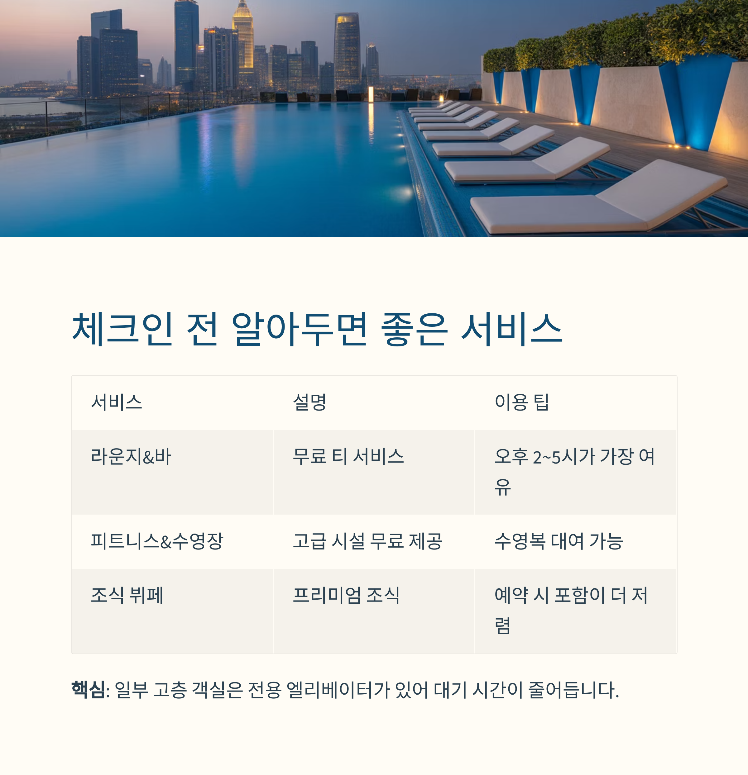 핵심: 일부 고층 객실은 전용 엘리베이터가 존재해, 대기 시간이 줄어듭니다