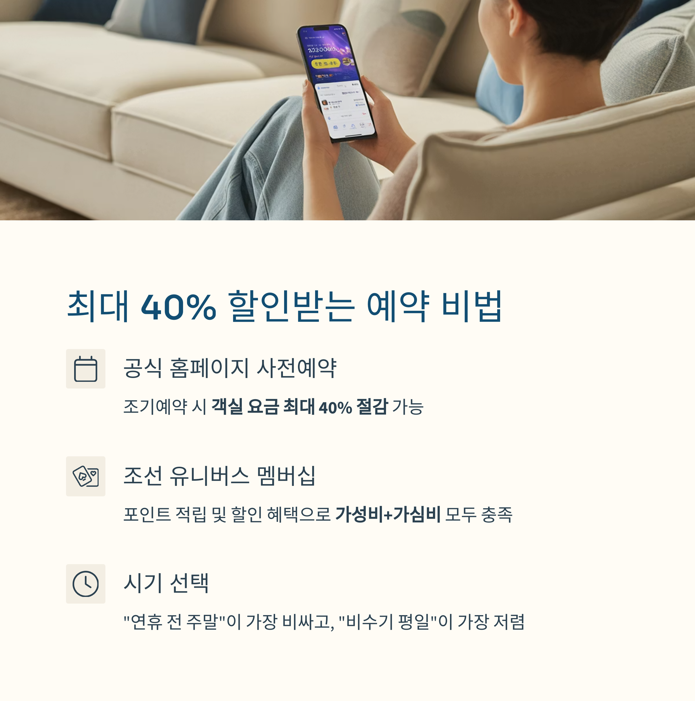 조기예약, 계절 이벤트, 연박 패키지를 잘 활용하면 객실 요금 최대 40% 절감도 가능합니다