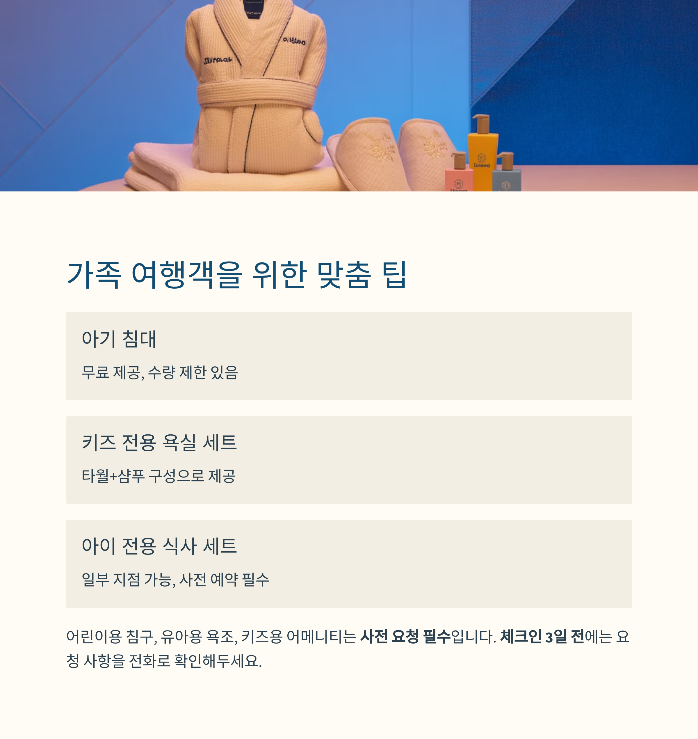어린이용 침구, 유아용 욕조, 키즈용 어메니티는 사전 요청 필수입니다
