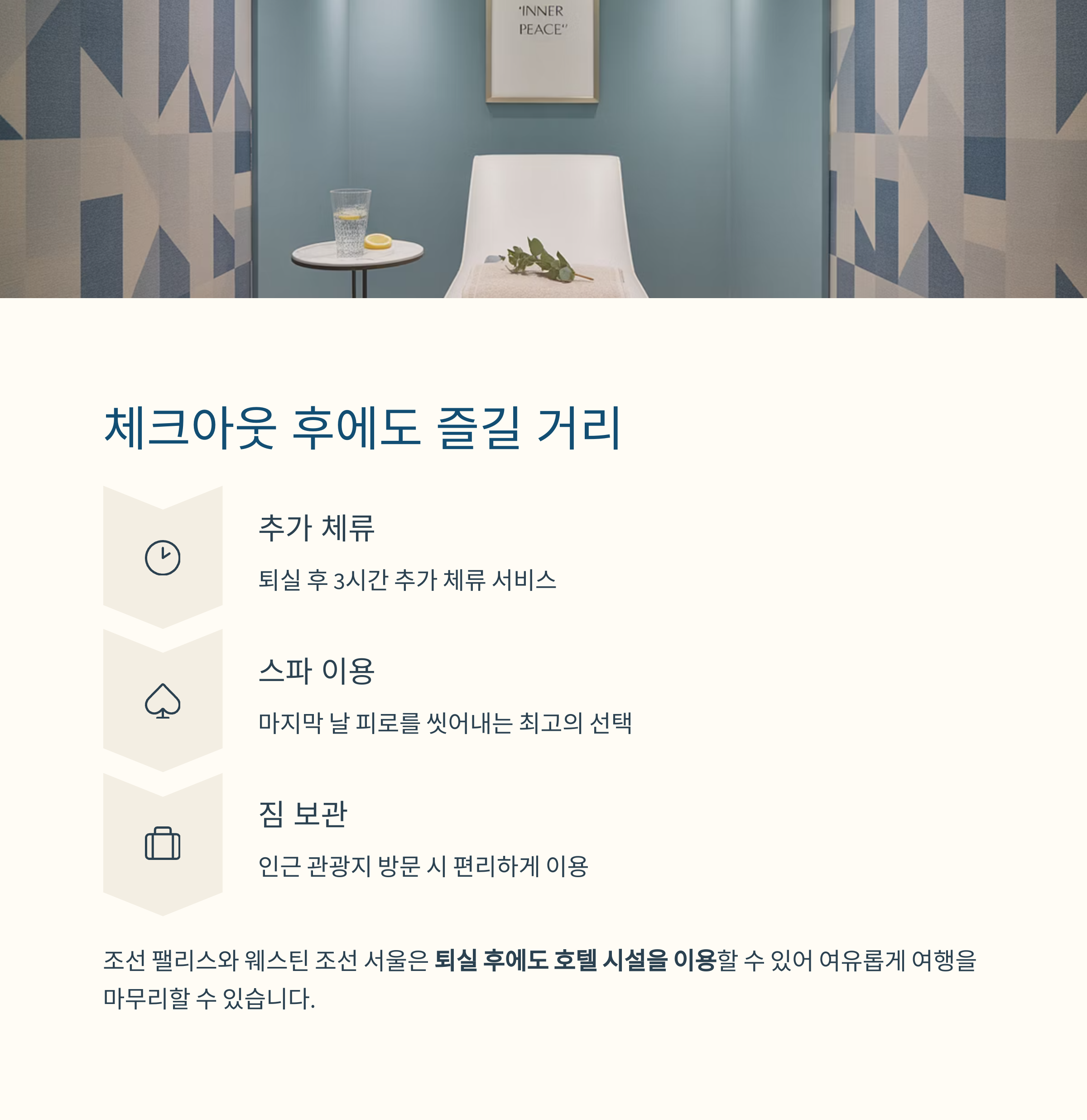 특히 조선 팰리스와 웨스틴 조선 서울은 퇴실 후에도 3시간 추가 체류 서비스를 제공해 여유롭게 마무리할 수 있습니다