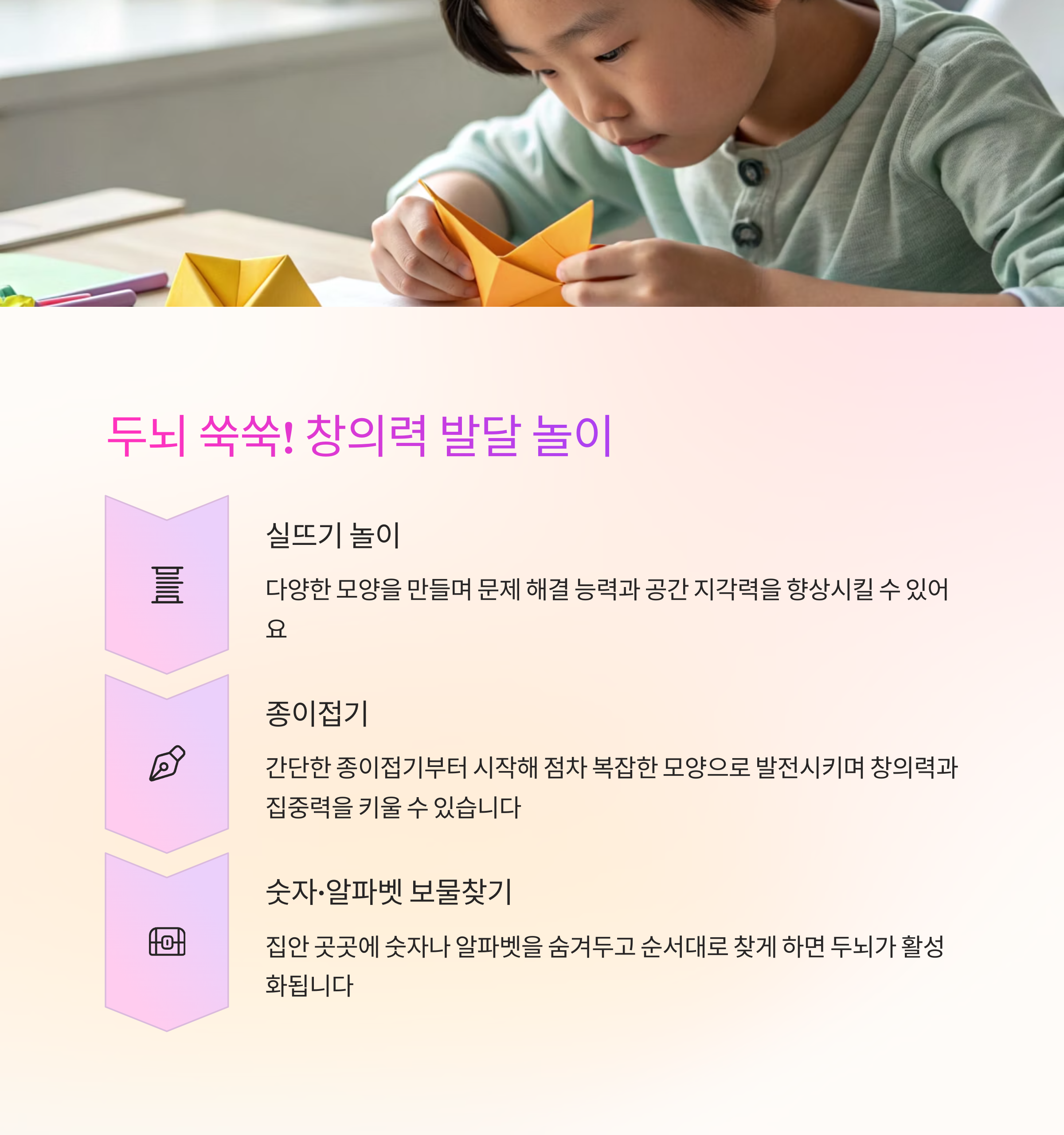 예를 들어, 실뜨기종이접기를 하면 자연스럽게 손 운동과 창의력이 길러지는데요, 이는 아이의 두뇌 활동을 효과적으로 촉진합니다.