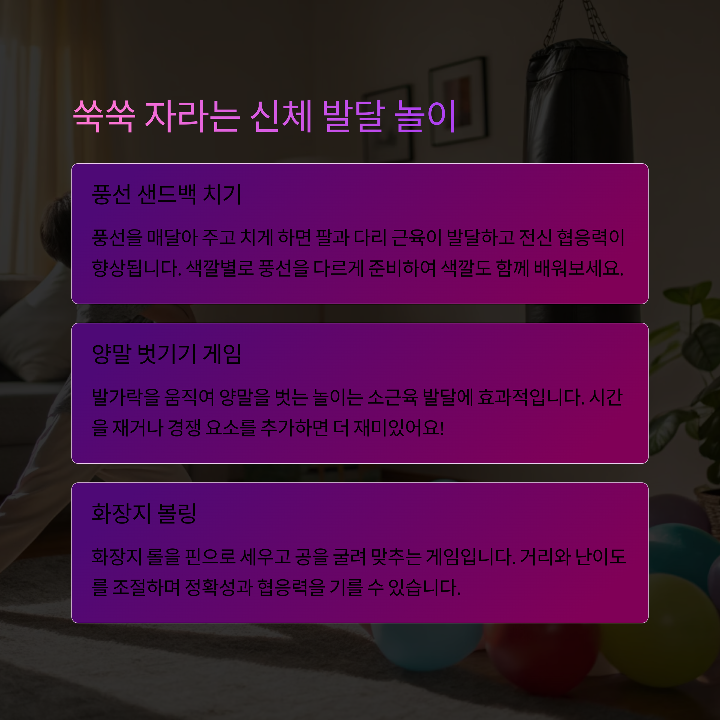 부모님들께서 집에서 아이와 함께 시간을 보내며 즐길 수 있는 놀이는 단순 재미를 넘어서 두뇌 발달신체 성장에도 영향을 미칩니다.