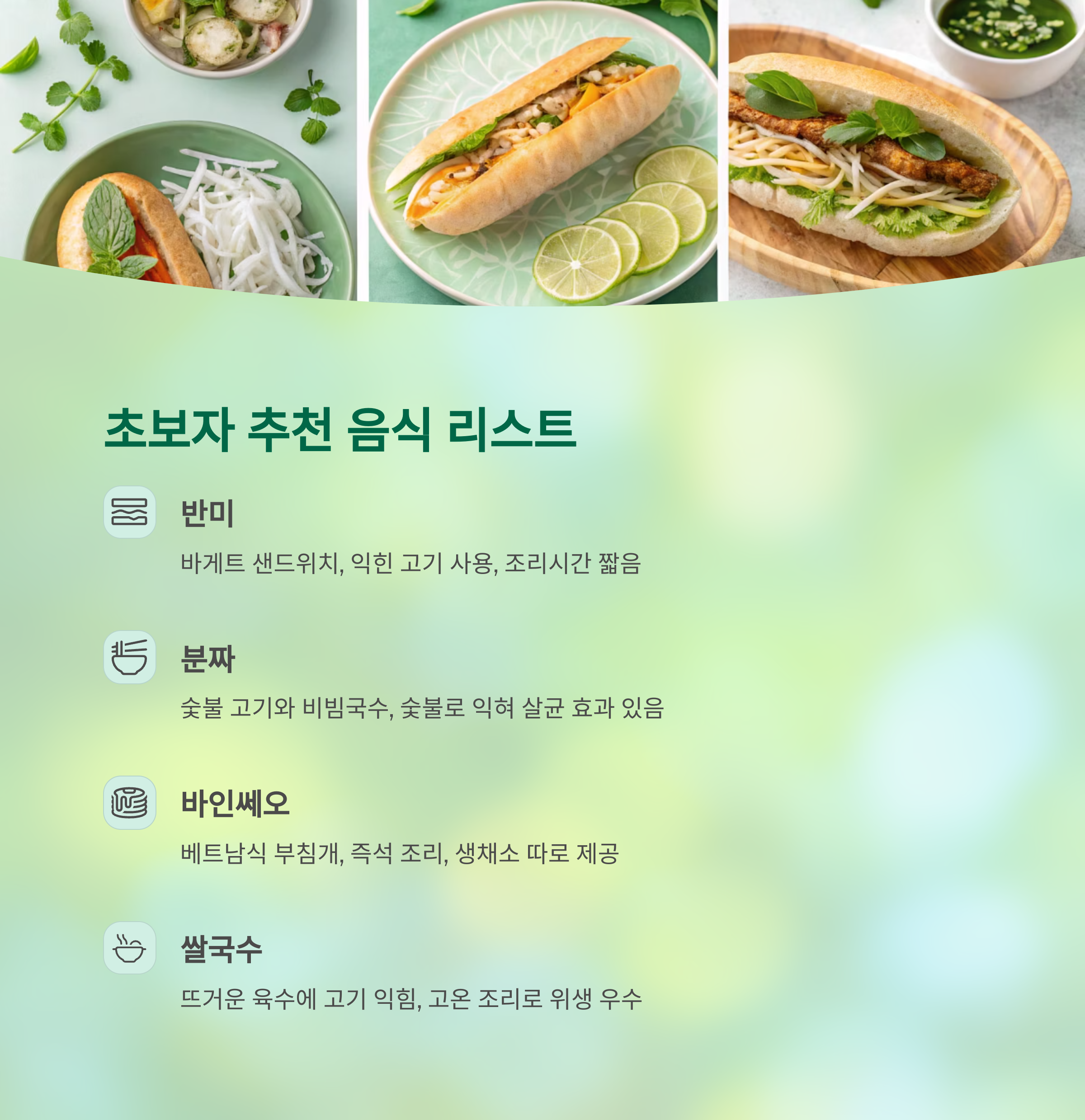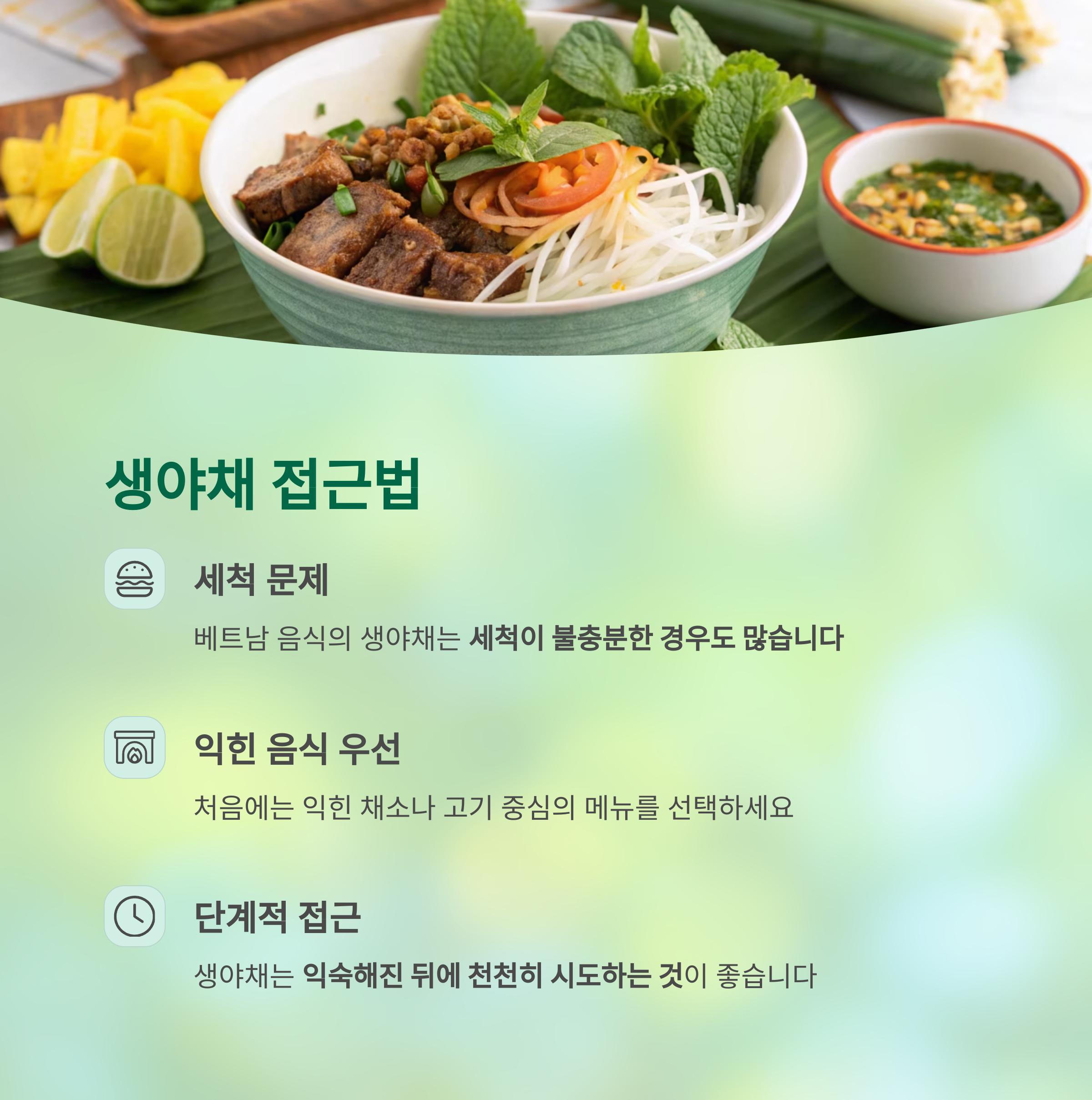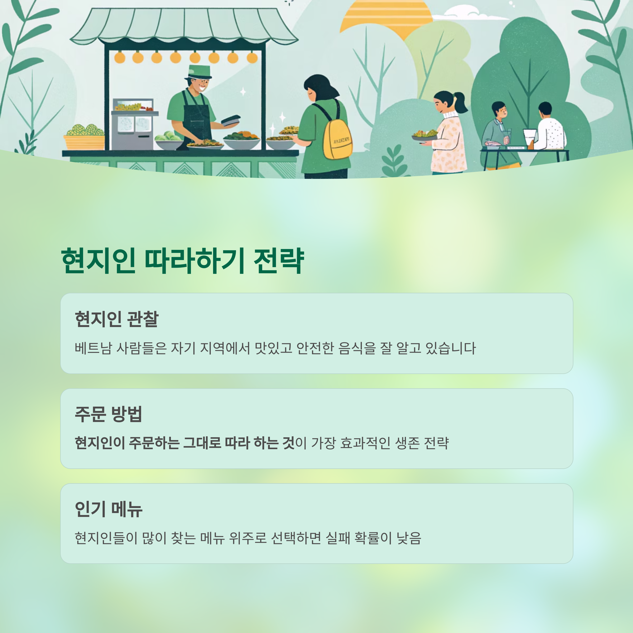 베트남 현지의 식문화를 존중하면서도 건강을 지키는 팁을 중심으로 구성했습니다.