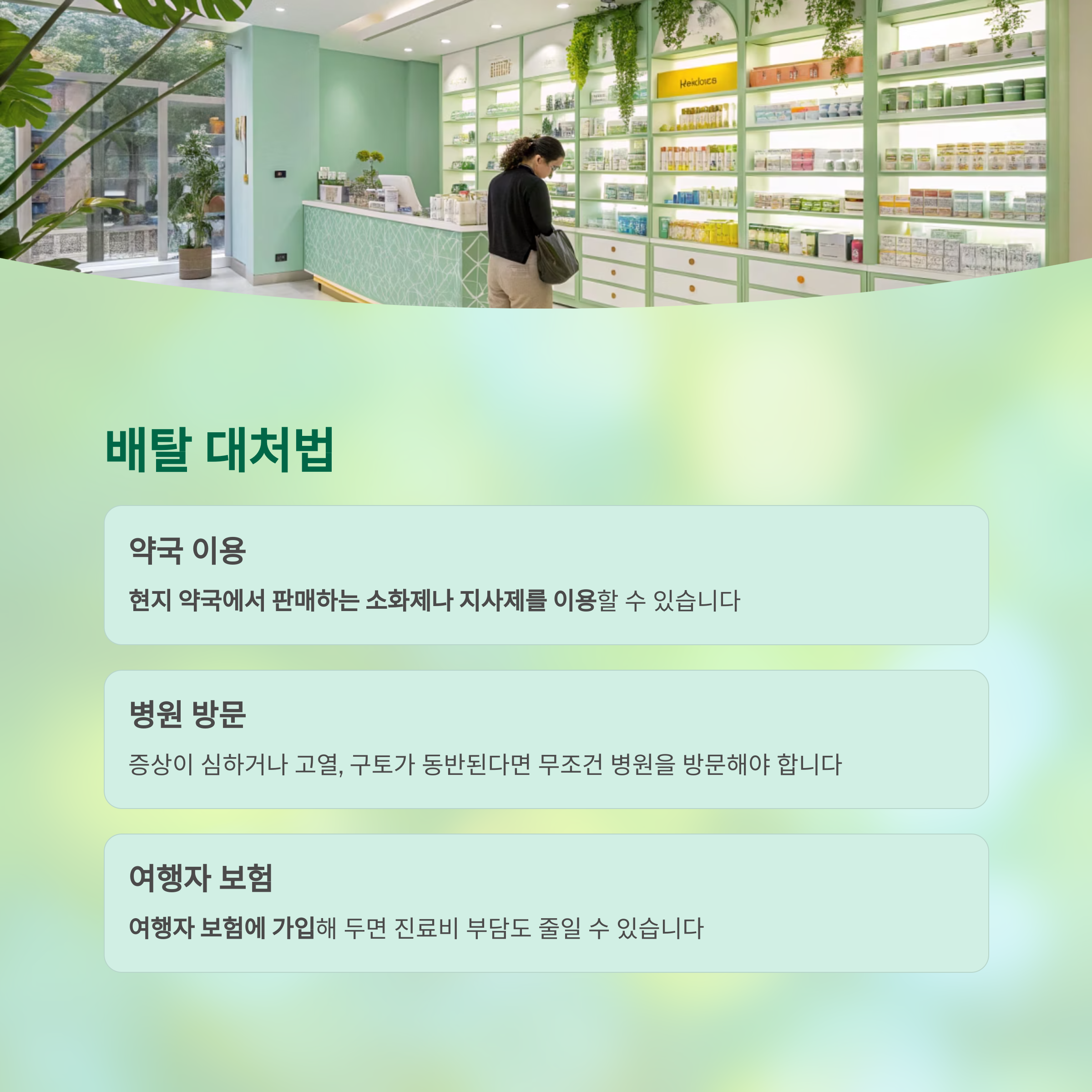 만약 위생 문제로 탈이 났다면, 현지 약국에서 판매하는 소화제나 지사제를 이용할 수 있습니다.