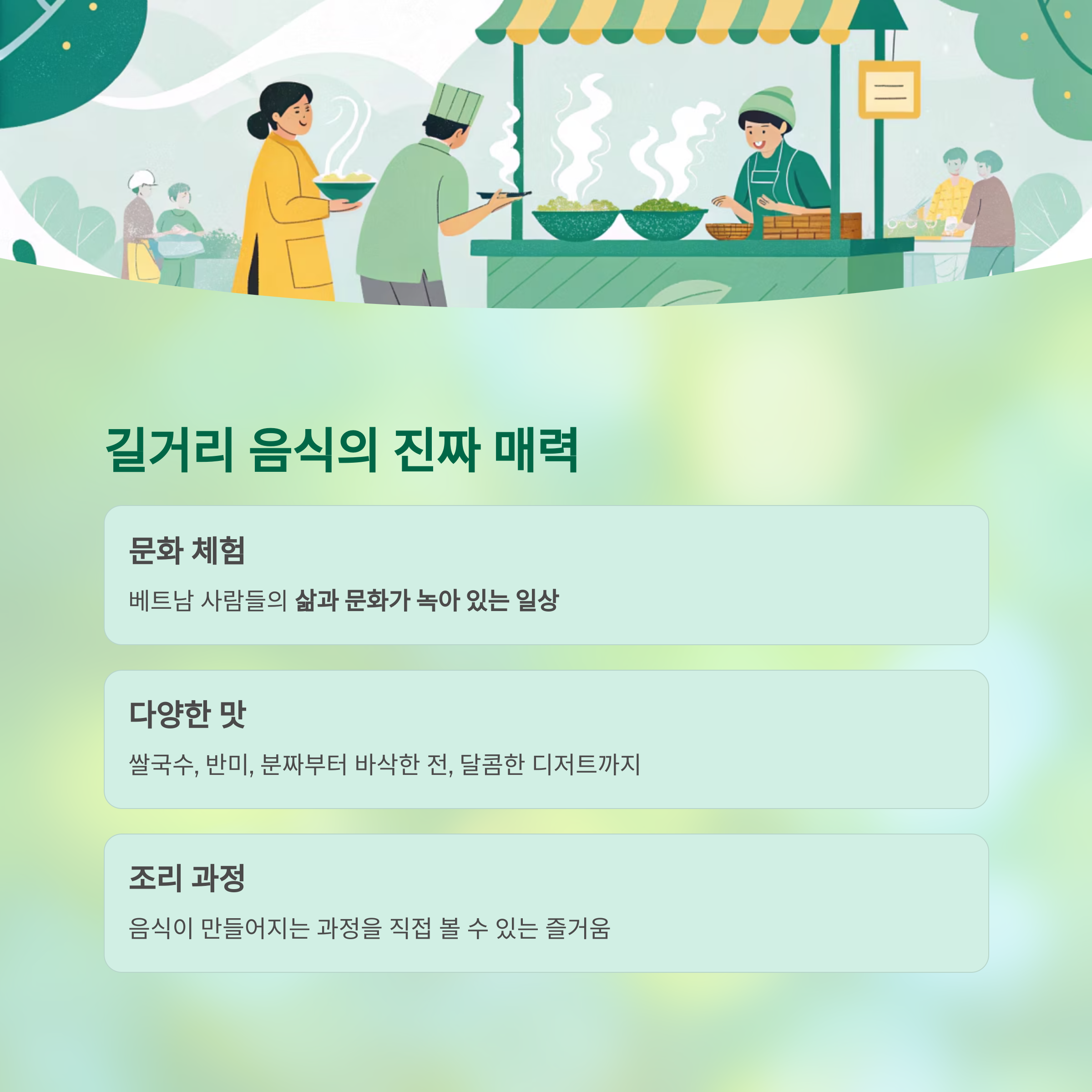 길거리 음식은 단순한 먹거리를 넘어 베트남 사람들의 삶과 문화가 녹아 있는 일상입니다.