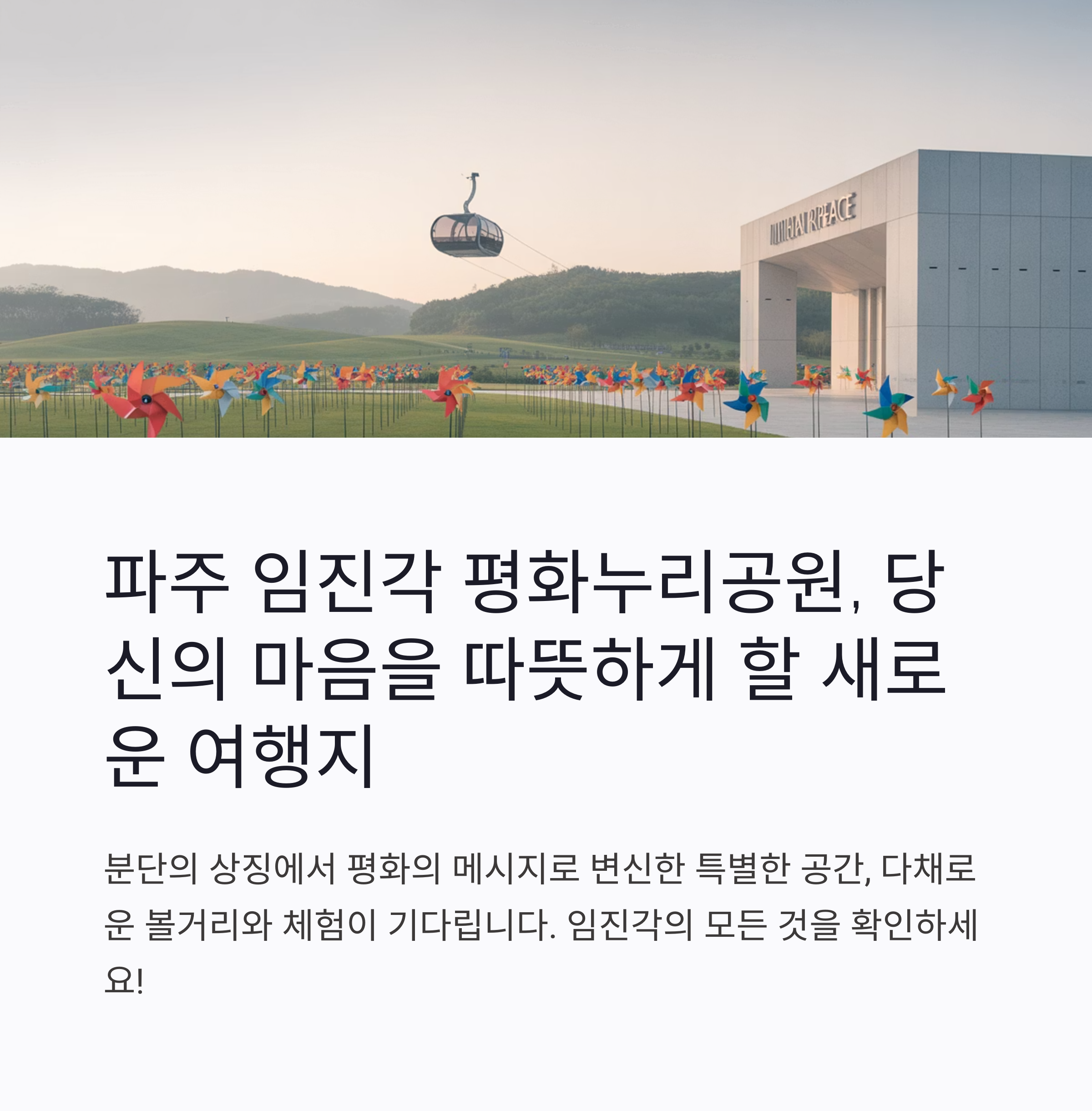 임진각 평화누리공원은 경기 파주시 임진각 일대에 위치한 복합 문화공간으로, 바람개비 언덕과 평화곤돌라, 드라마 촬영지 등 다양한 볼거리와 체험거리를 제공합니다. 연중 운영되며 계절별로 특별 이벤트가 열려 가족 단위 나들이나 커플 여행지로도 인기가 많습니다. 특히 분단의 상징에서 평화의 메시지를 전달하는 장소로 의미도 깊습니다.