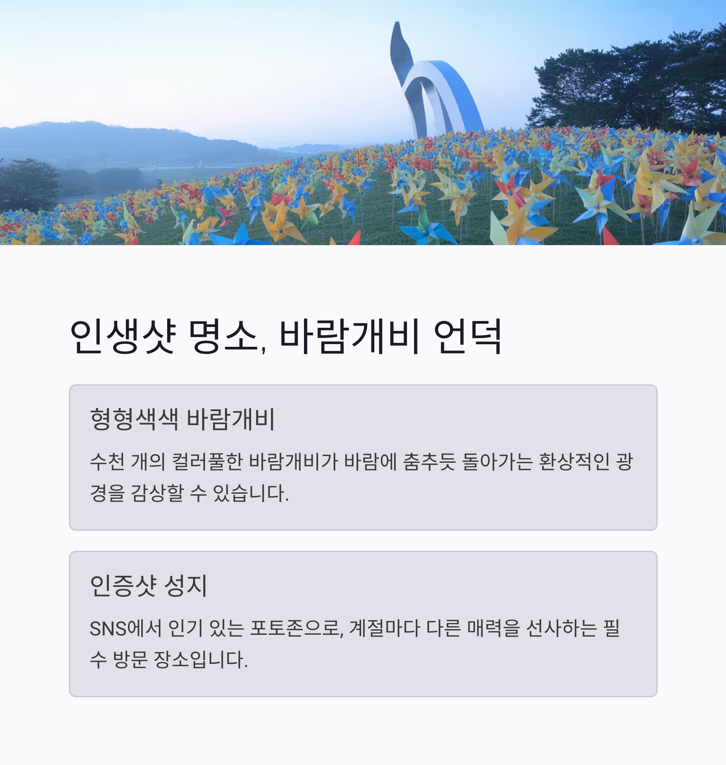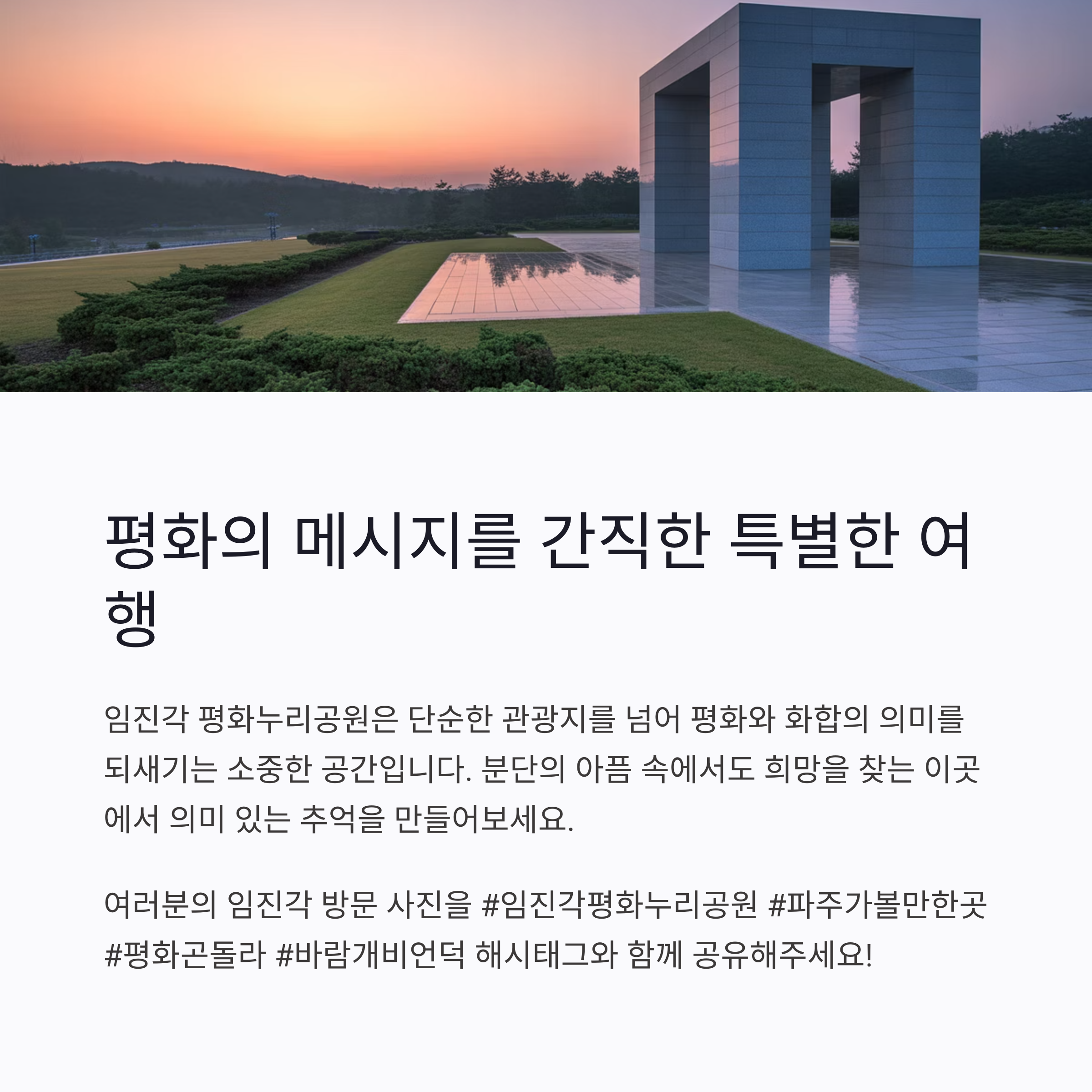임진각 평화누리공원은 경기 파주시 임진각 일대에 위치한 복합 문화공간으로, 바람개비 언덕과 평화곤돌라, 드라마 촬영지 등 다양한 볼거리와 체험거리를 제공합니다. 연중 운영되며 계절별로 특별 이벤트가 열려 가족 단위 나들이나 커플 여행지로도 인기가 많습니다. 특히 분단의 상징에서 평화의 메시지를 전달하는 장소로 의미도 깊습니다.