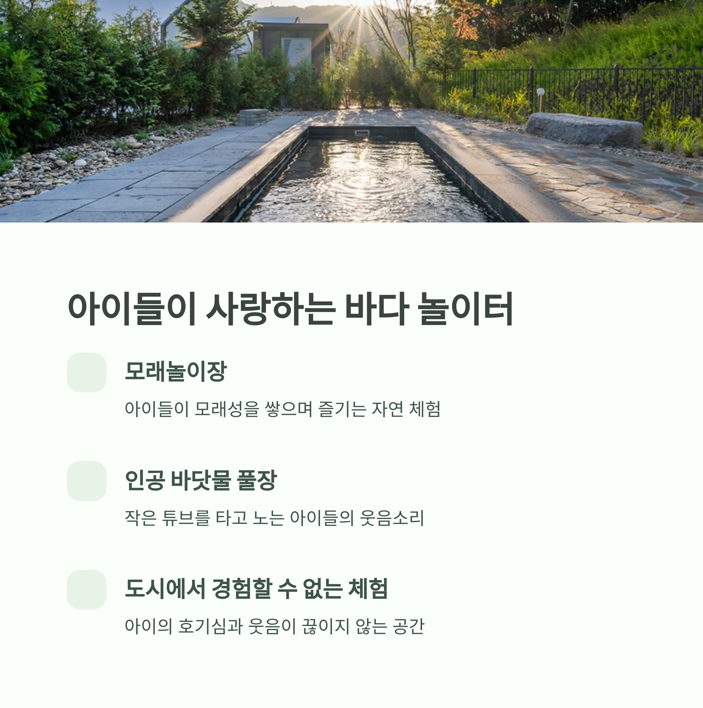 아이들이 가장 좋아했던 공간은 모래놀이장과 얕은 인공 바닷물 풀장이었습니다.