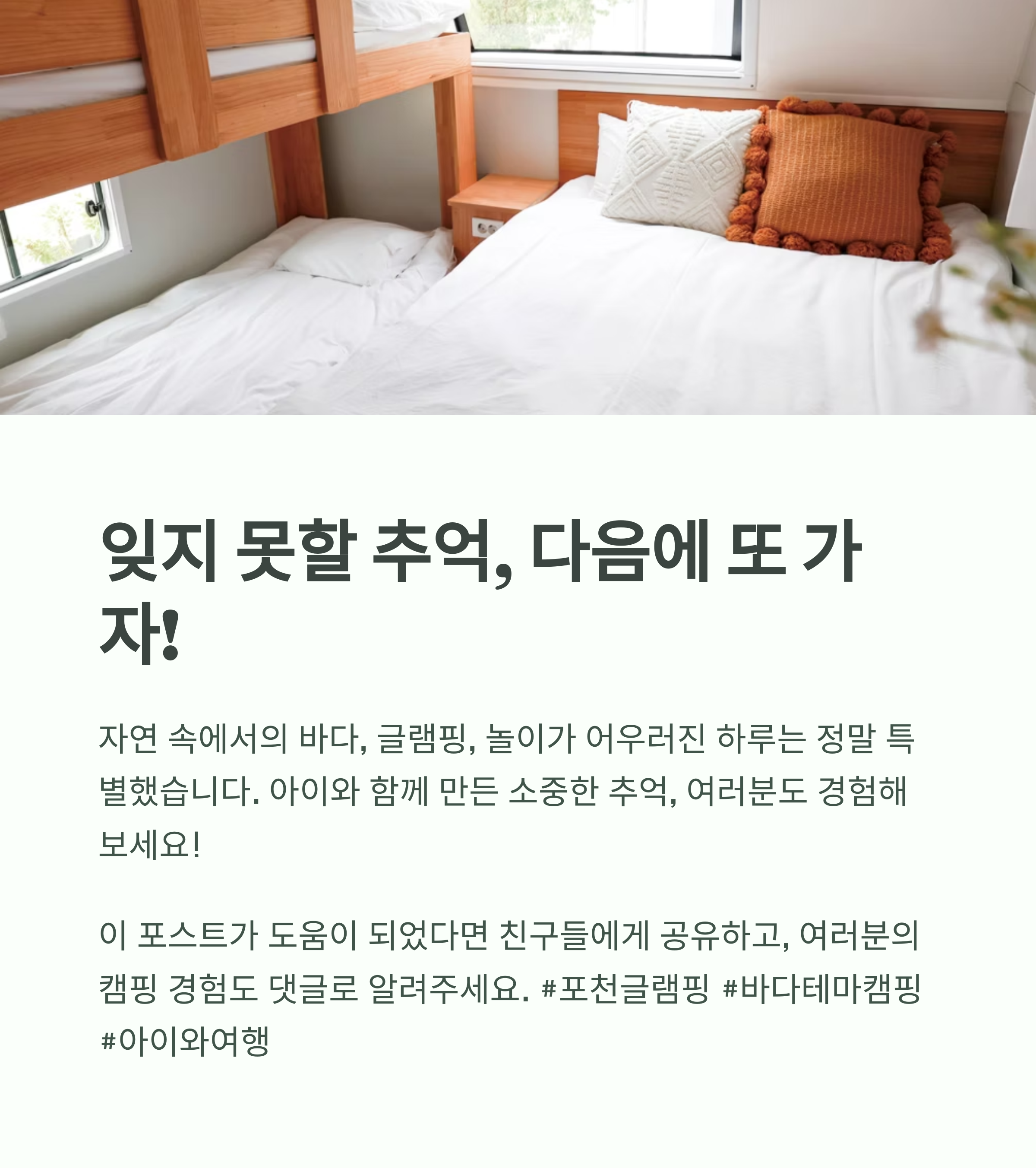자연 속에서의 바다, 글램핑, 놀이가 어우러진 하루는 정말 만족스러웠습니다.