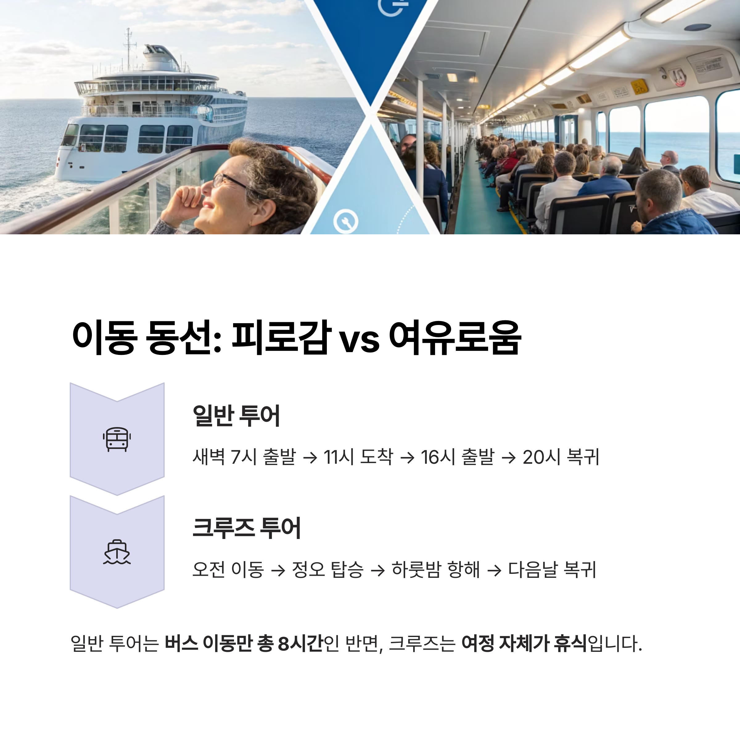 천천히 몰입하고 여운을 느끼고 싶다면 크루즈 투어가 적합합니다.