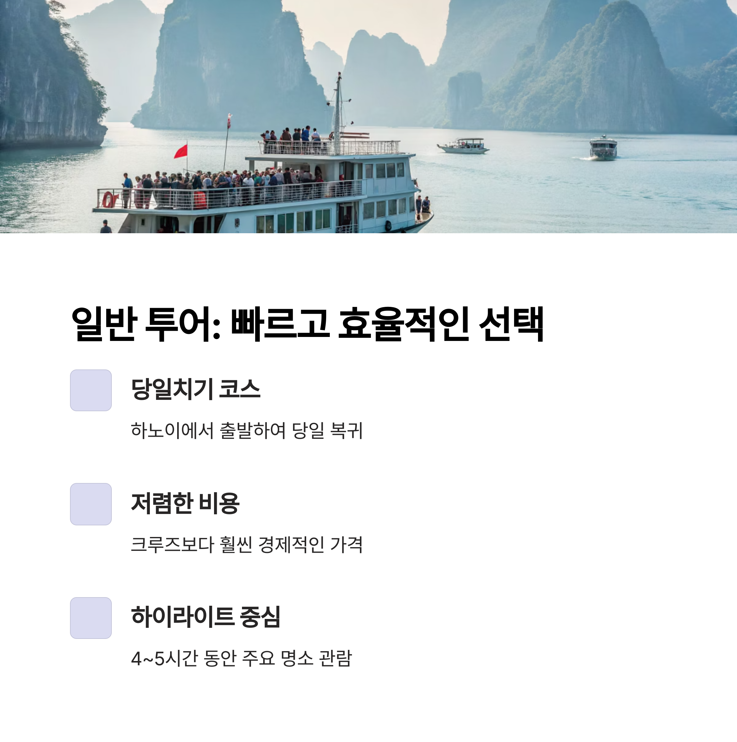 빠르게 하롱베이의 하이라이트만 경험하고 싶은 여행자에게 적합한 선택입니다.
