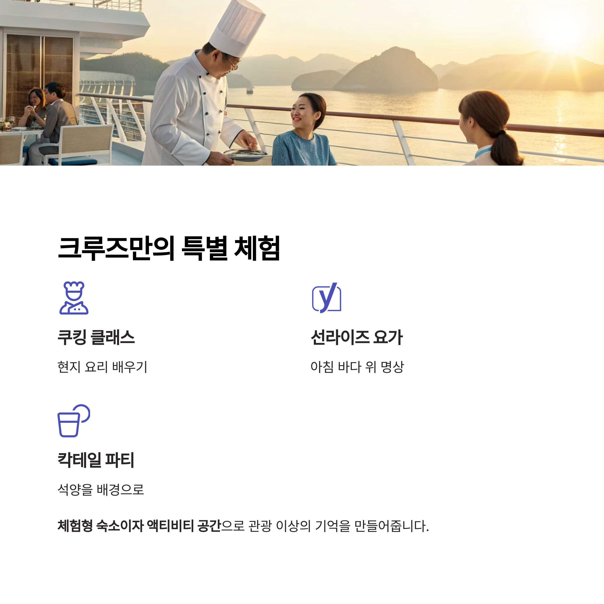 배 안에서의 쿠킹 클래스, 선라이즈 요가, 현지식 BBQ, 칵테일 파티 등