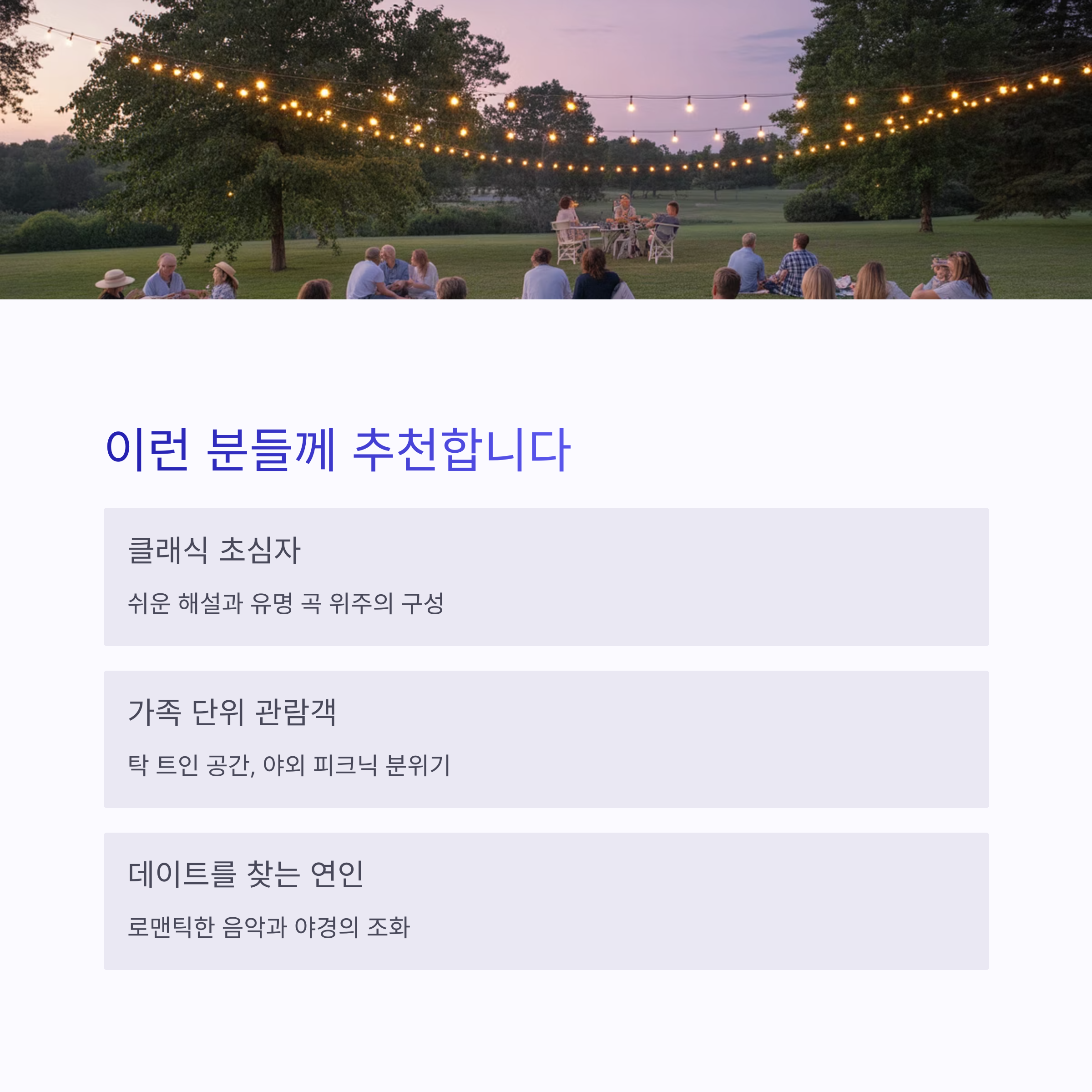 | 클래식 초심자 | 쉬운 해설과 유명 곡 위주의 구성 |