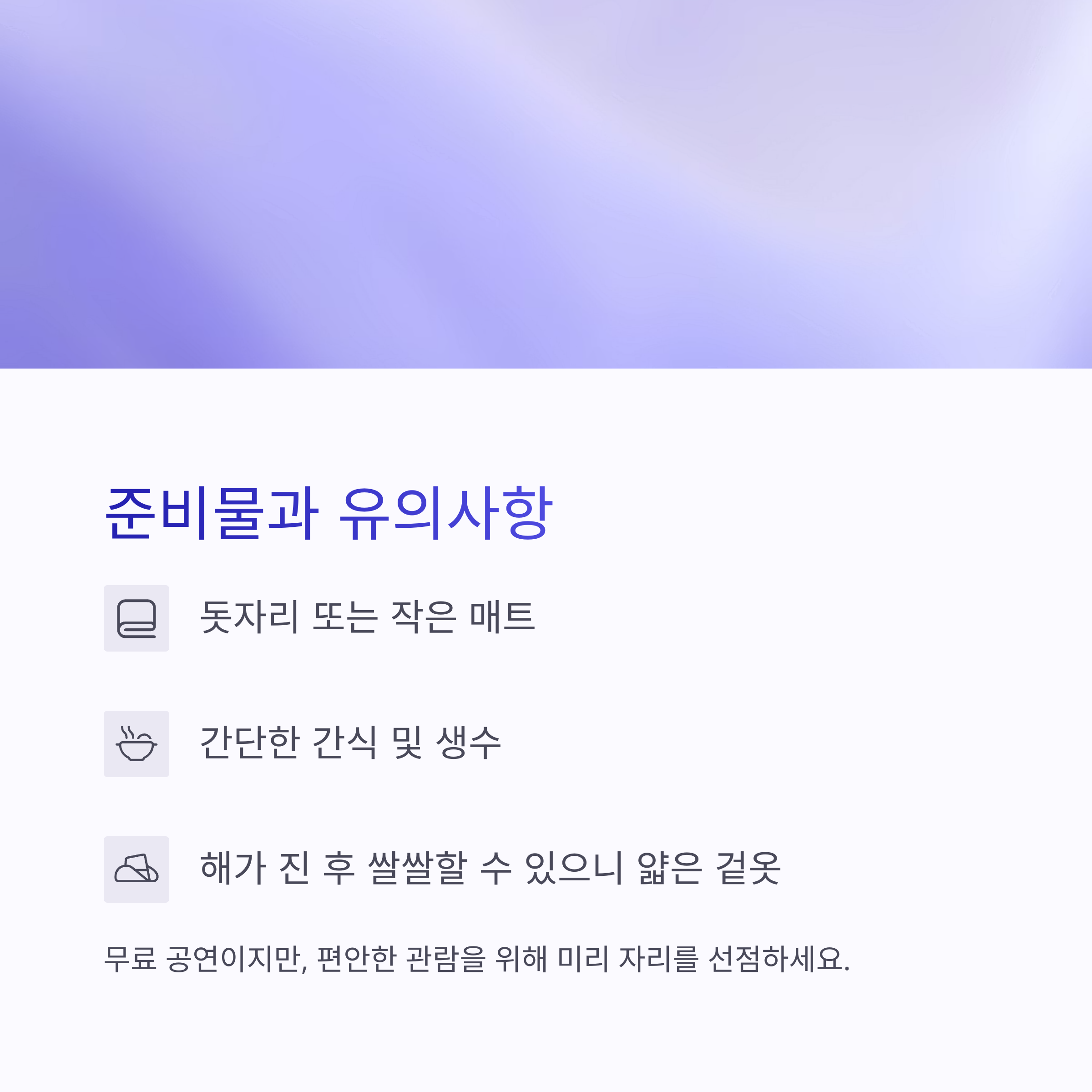 - 해가 진 뒤엔 쌀쌀할 수 있으니 얇은 겉옷 권장