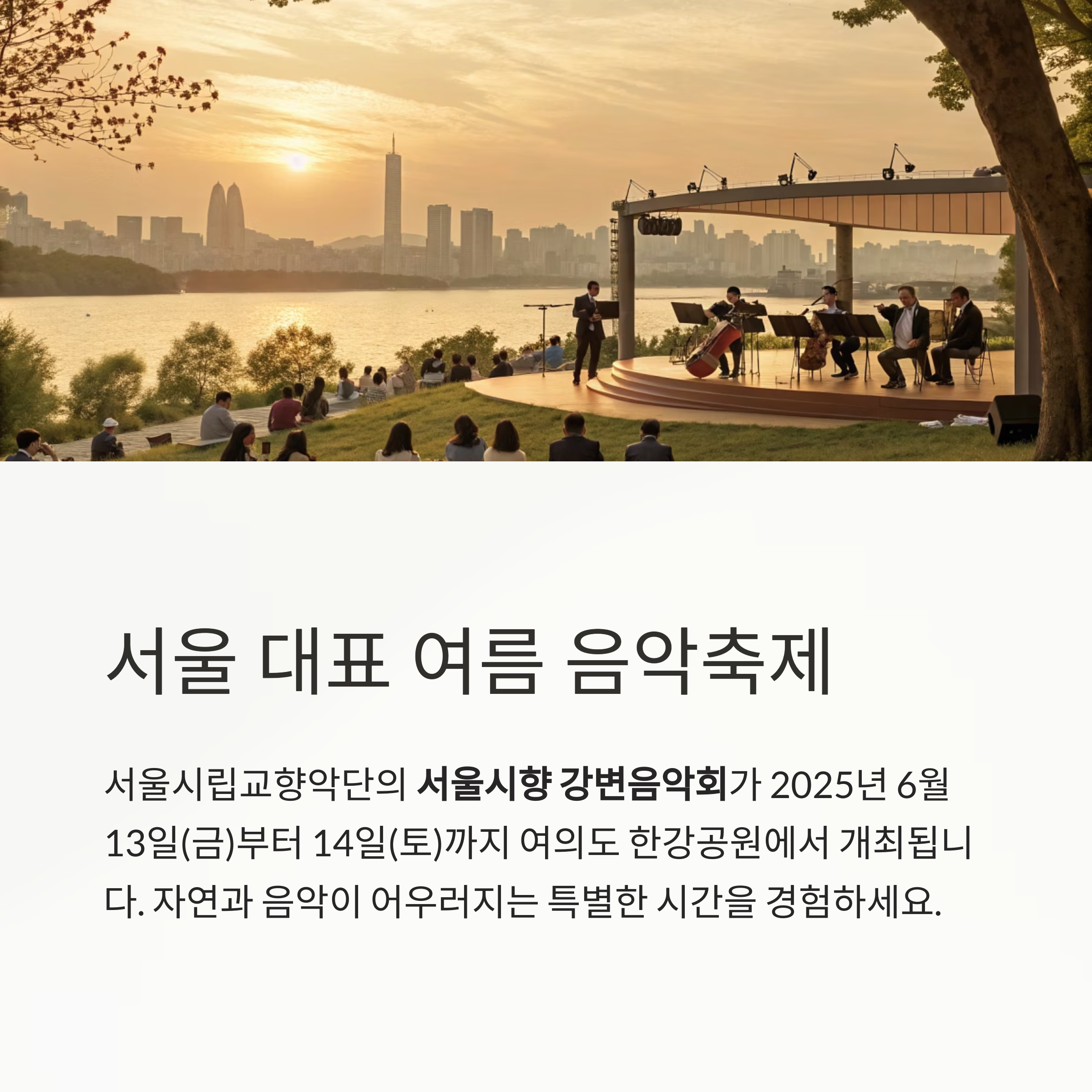 서울시향은 이 강변음악회를 통해 시민 모두가 쉽게 음악을 접할 수 있는 기회를 제공하고자 합니다.