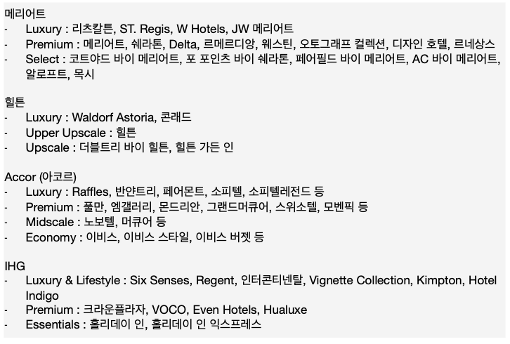 | 호텔 가격 최대 50% 포인트로 결제 가능 | 힐튼 1:2, 메리어트 1:1 비율로 전환 가능 | 룸 업그레이드, 조식, Late Check-out 제공 |
